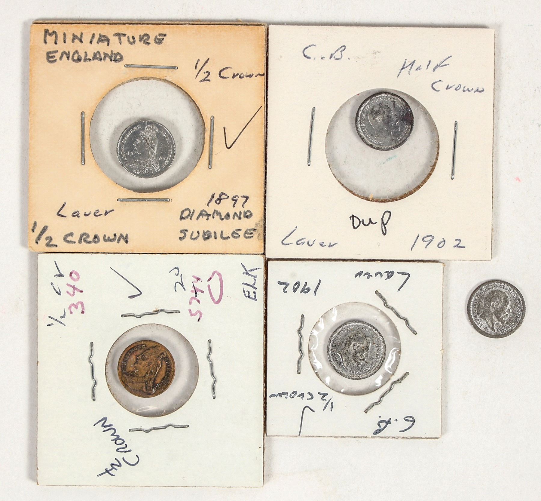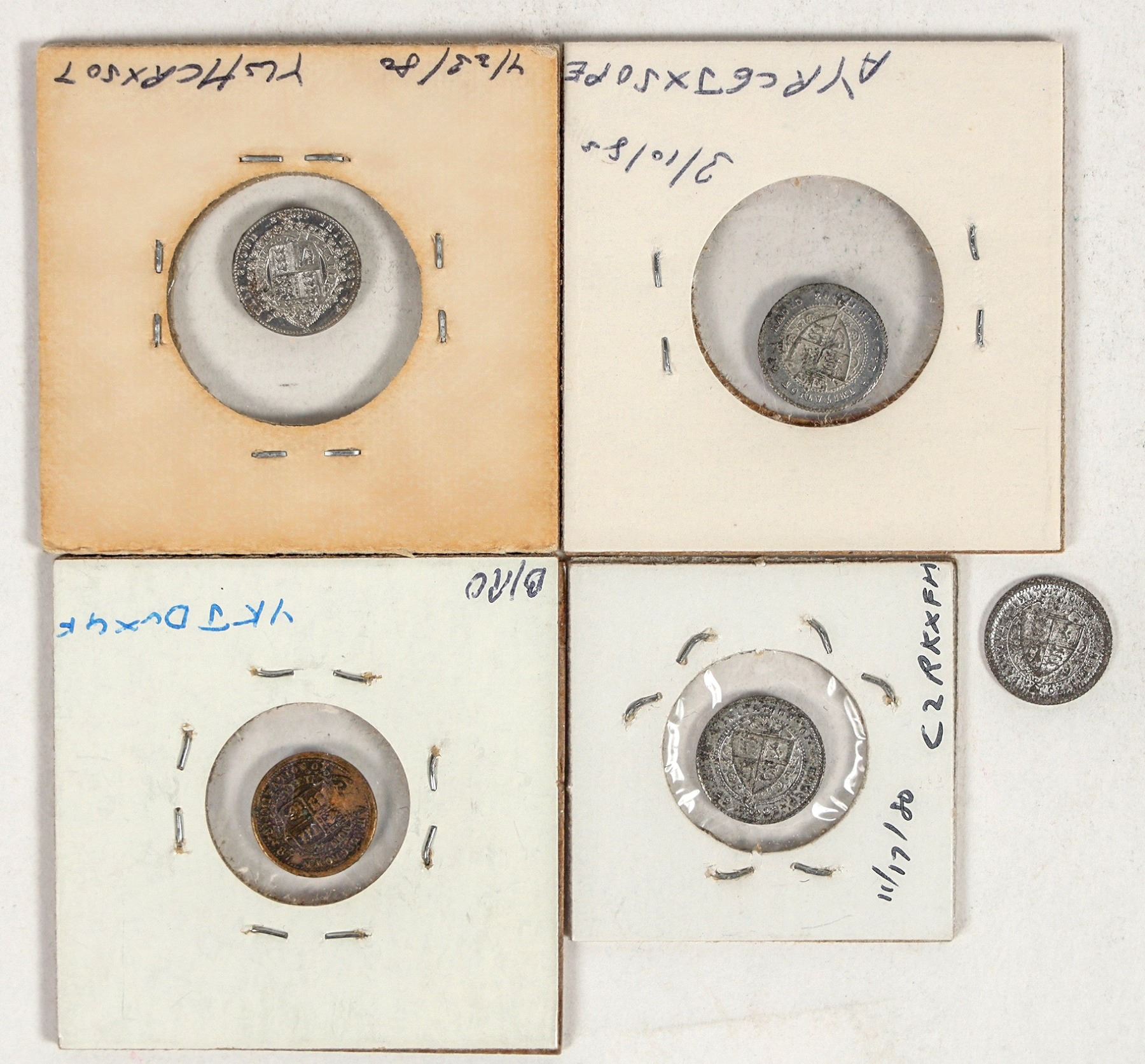 Four zinc and one brass Lauer gaming counters in the form of a British 1/2 Crown coin. Three bear the image of King George VIII, while two have the image of Queen Victoria. All have the same spade-shaped coat of arms, but details vary. 12mm diameter.