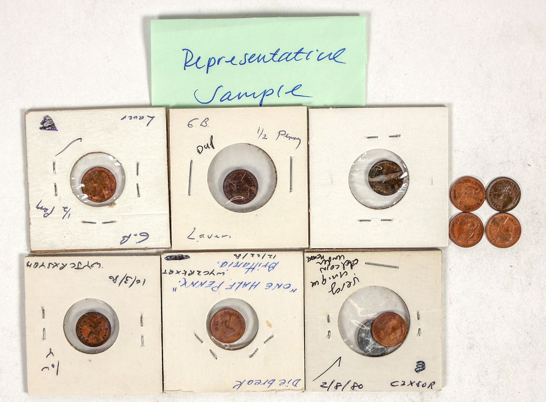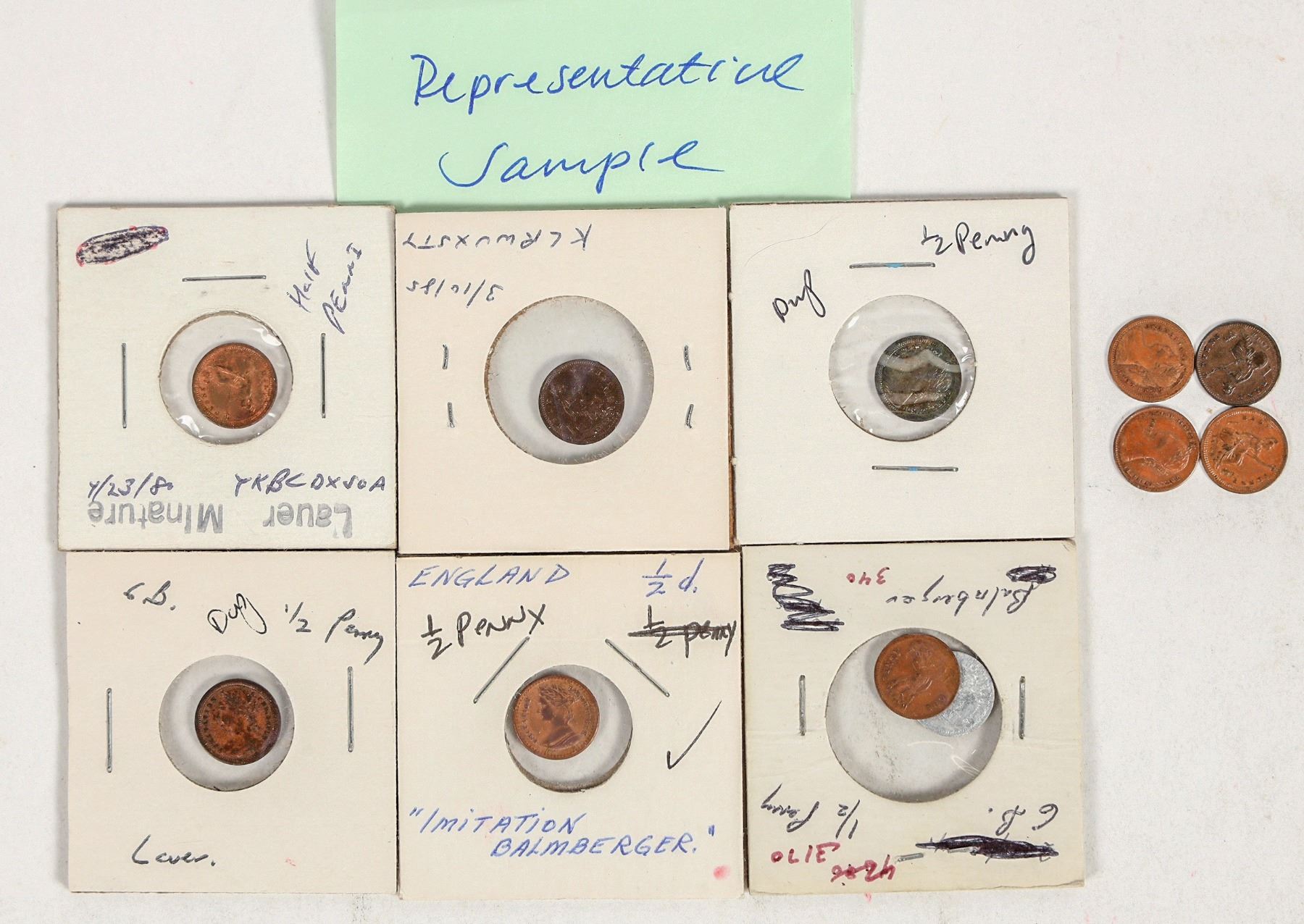 Twelve brass (most) and zinc (a few) Lauer gaming counters in the form of a British 1 farthing coin. No dates evident. Obverse is an image of a younger-looking Queen Victoria, reverse is a seated figure, probably representing Britannia. 12mm diameter.