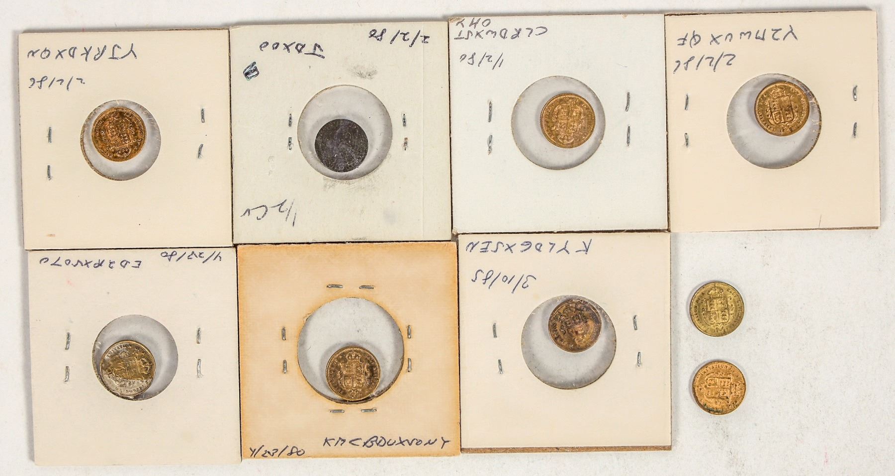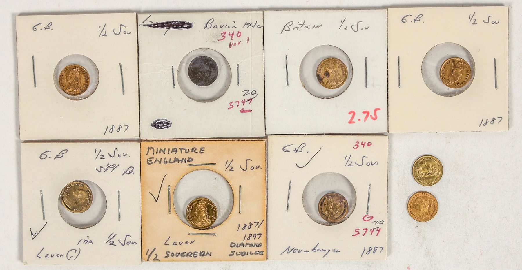 Twenty-one Lauer miniature gaming counters in the design of a British half sovereign coin. Dated 1887 and 1902 and bearing an image of Queen Victoria. 12mm diameter.