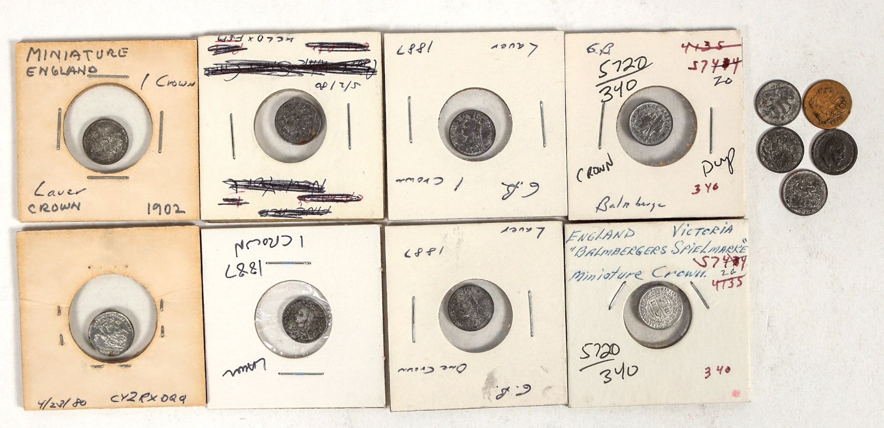 Eighteen brass and zinc Lauer gaming counters in the form of a British 1 Crown coin. Most obverses have Queen Victoria, but a few have King George VIII. Reverses vary between King George and the Dragon and a coat of arms motif. 12mm diameter.
