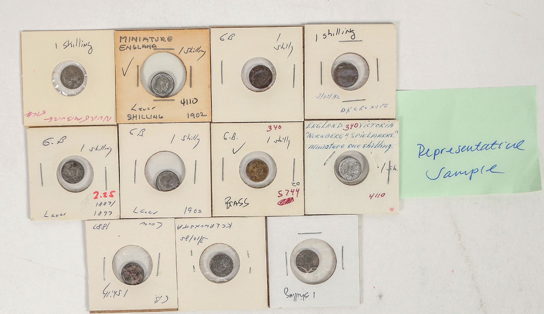 Twenty-eight Lauer miniature gaming counters in the design of a British one shilling coin. Dated 1887, 1897, and 1902 and bearing an image of Queen Victoria. Some reverses have the words ONE SHILLING and a crown with a laurel wreath. Others depict a coat of arms, and others have a British lion atop a crown. 12mm diameter. Mostly brass, a few zinc.