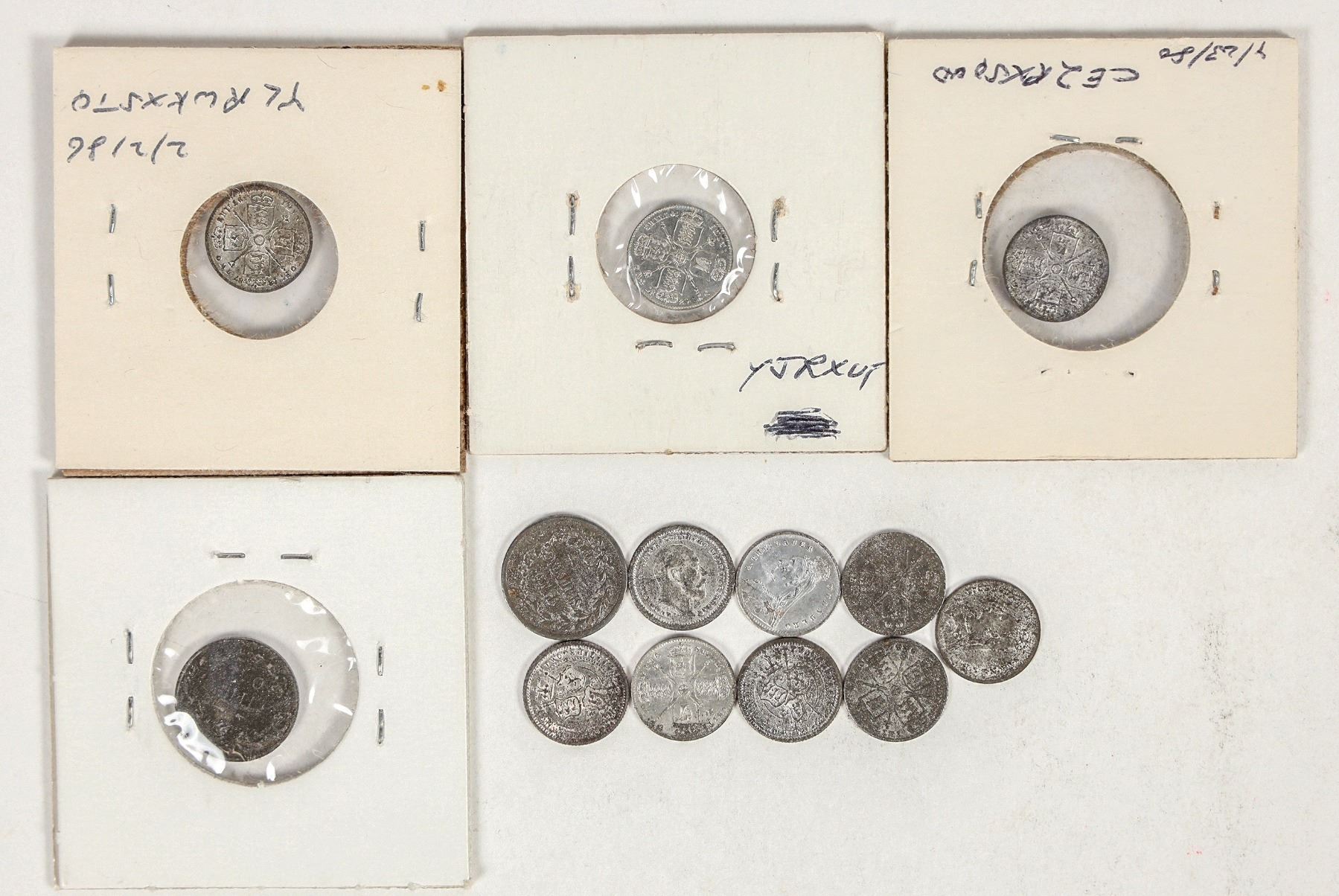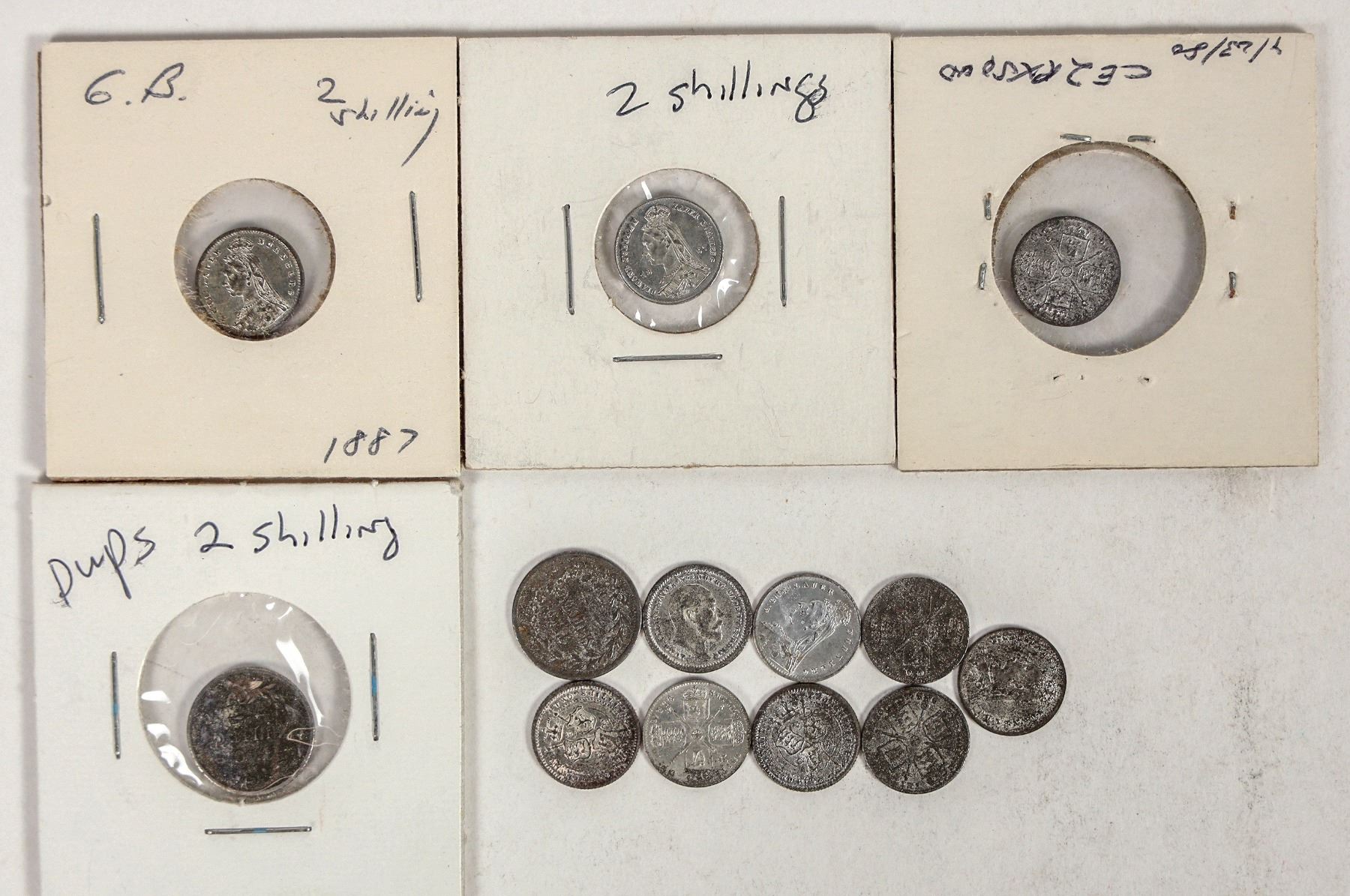 Thirteen Lauer miniature gaming counters in the design of a British two shilling coin. Dated 1887 and bearing either the image of Queen Victoria or King George VIII. Reverses vary in coat of arms designs. 12mm diameter.