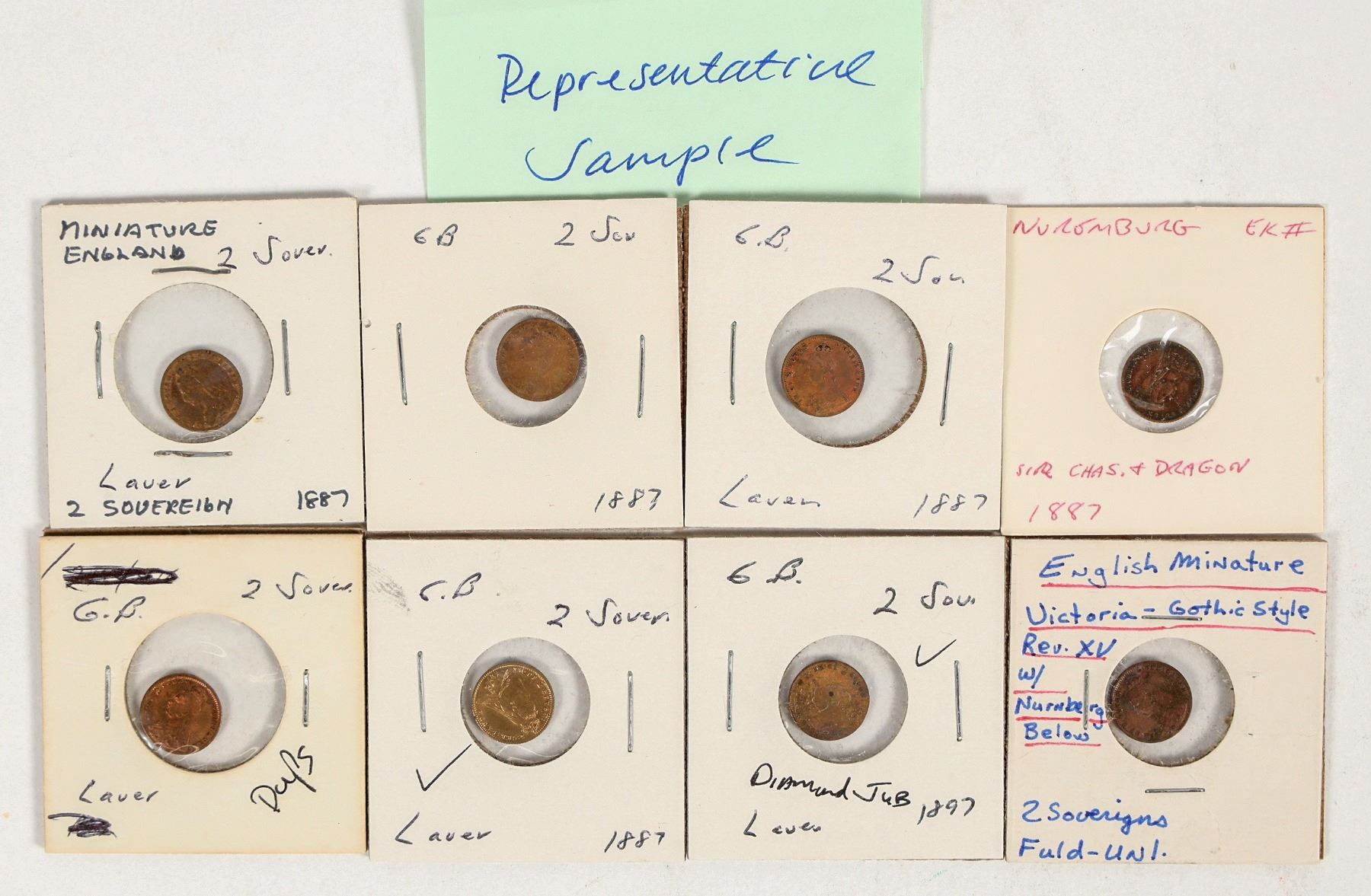 Fourteen thin brass Lauer gaming counters in the form of a British 2 sovereign coin. All bear the image of Queen Victoria and all reverses depict St. George and the Dragon. 12mm diameter.