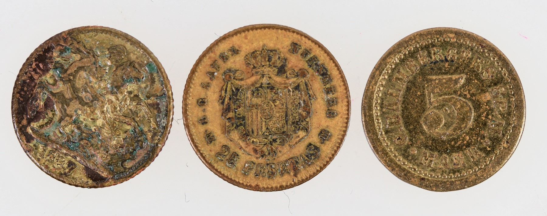Three brass Lauer gaming counters in the form of coins from three different countries. Great Britain 5 sovereign coin: Queen Victoria obv., St George and the Dragon rev; 25 pesetas coin, King Alfonso XII obv., coat of arms rev; Germany 5 marks coin, Kaiser Wilhelm obv., large 5 rev. All 12mm diameter.