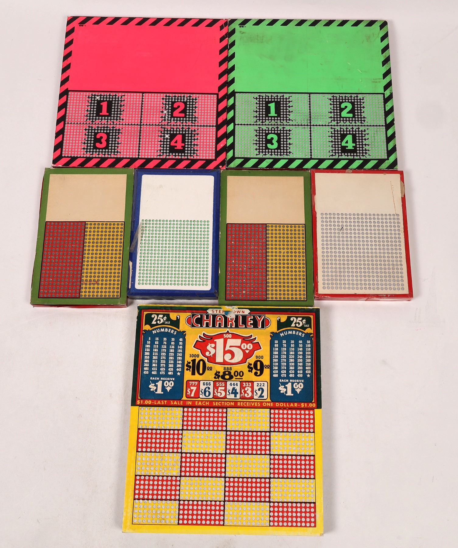 7 unused gaming punch cards. Charley is only one marked, 10.25x8.75" with top wear. 65unmarked about 7.25x4.75". 1x 9.25x9".