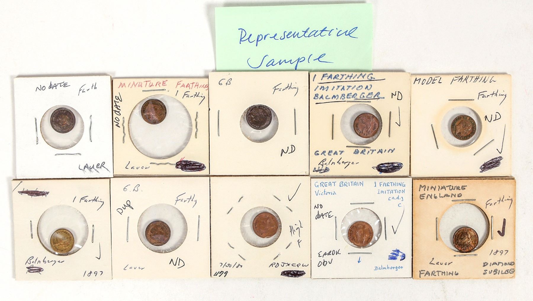 Nineteen Lauer gaming tokens in the form of a British 1 farthing coin. Dated 1881 and 1897. A younger-looking Queen Victoria on the obverse and a seated figure who may represent Britannia on the reverse.