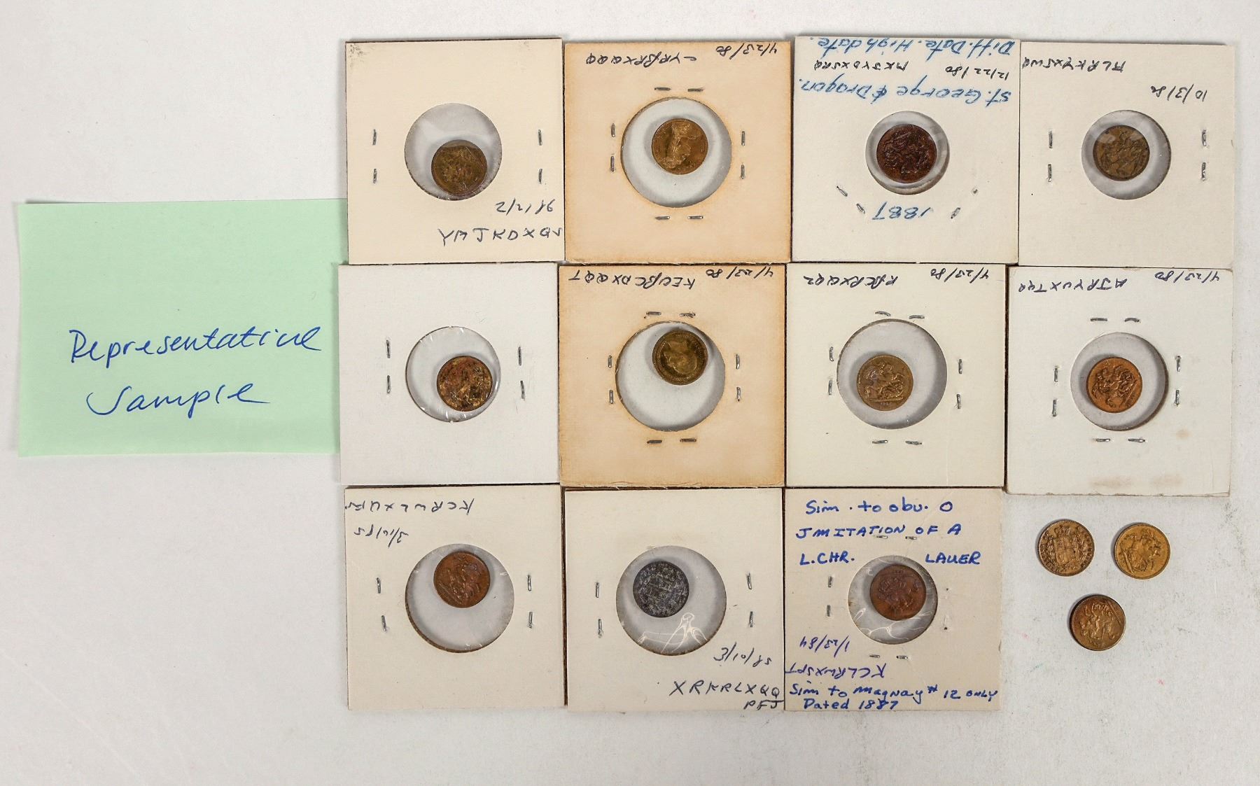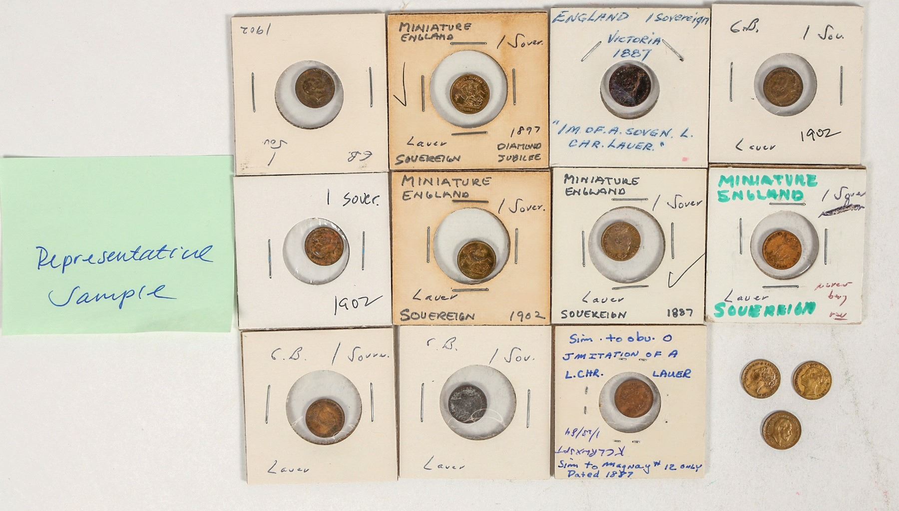 Twenty-seven Lauer miniature gaming counters in the design of a British one sovereign coin. Dated 1887 and 1902 and bearing an image of Queen Victoria. Reverse depicts St. George and the Dragon. 12mm diameter.