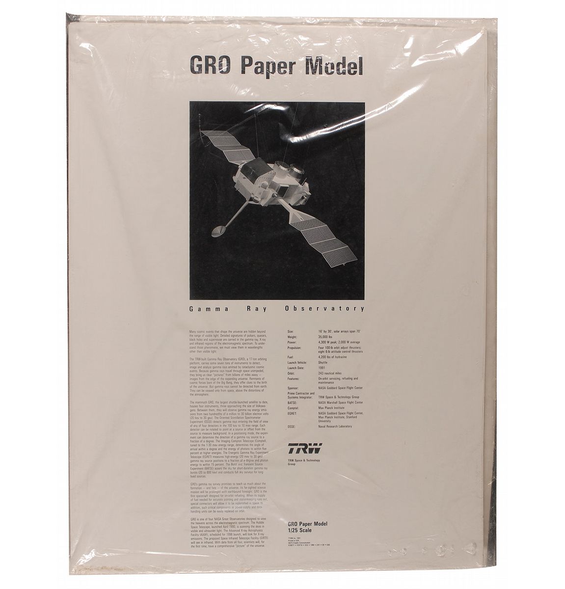 Scarce unopened 1/25 scale paper model of the Gamma Ray Observatory, 19 x 25, produced by TRW Space and Technology Group in 1991. Model is sealed in its original plastic. In fine condition.