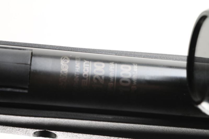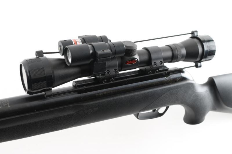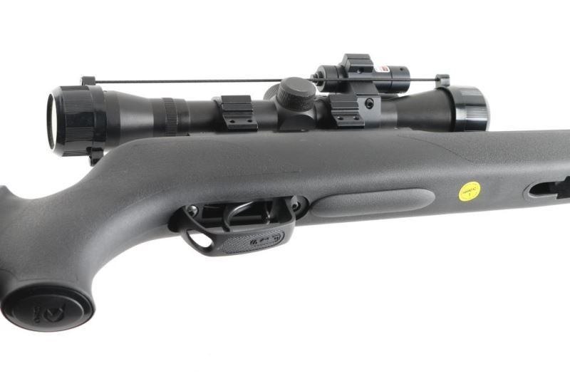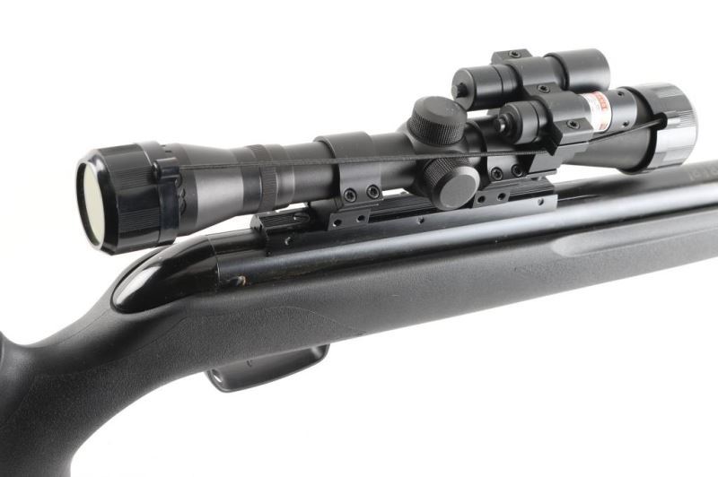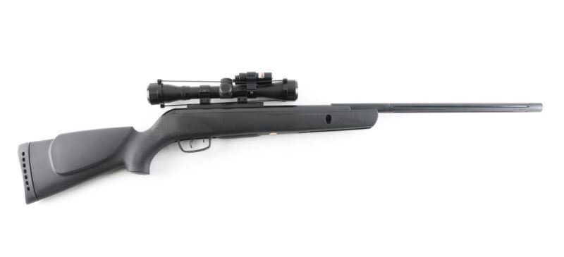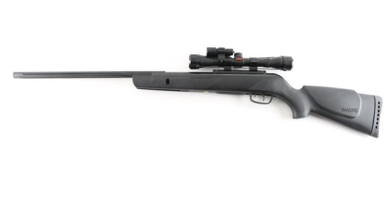 Sn: 04-1c-125309-07 Single-Shot. 30 Lb break-Action. Spring piston.18" grooved barrel, 43" overall. 2 stage trigger. Lever safety. Rifled barrel. black synthetic, ambidextrous stock. Mounted with a Gamo 4x32 scope with flashlight and laser. Like new condition in original box.