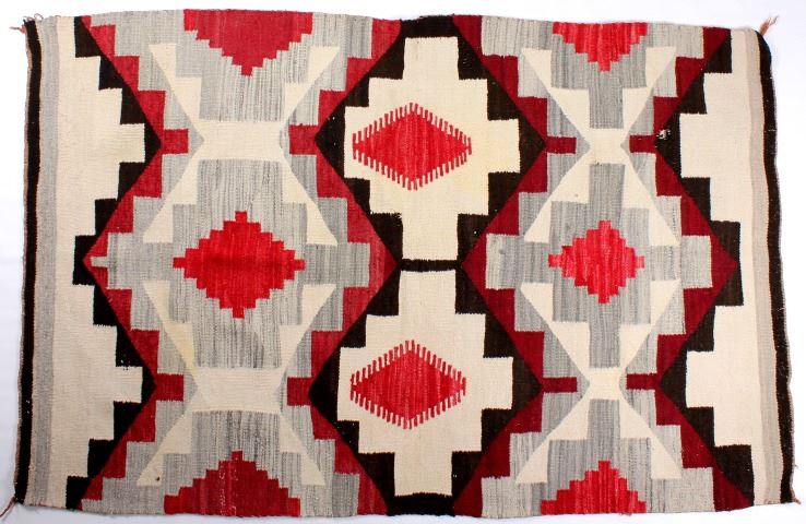 You are bidding on an excellent example of a Ganado style Navajo rug. According to *Charley's Navajo Rugs website, "[Gandado is] in the geographic center of the Navajo Reservation...The [Ganado] motif generally consists of one or more stepped diamonds or stepped and embellished triangles." Red, gray, black, and ivory are dominate colors in the designs. This rug shows 100% wool construction with the stepped diamonds and triangles with natural pigmented gray, red, brown, and ivory. The rug , believed to be early to mid 1900's, is in very good condition, but does have a somewhat loose selvedge cord in one corner and a few small holes near one end. The rug measures 71" x 45".