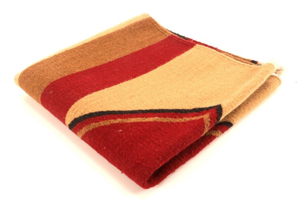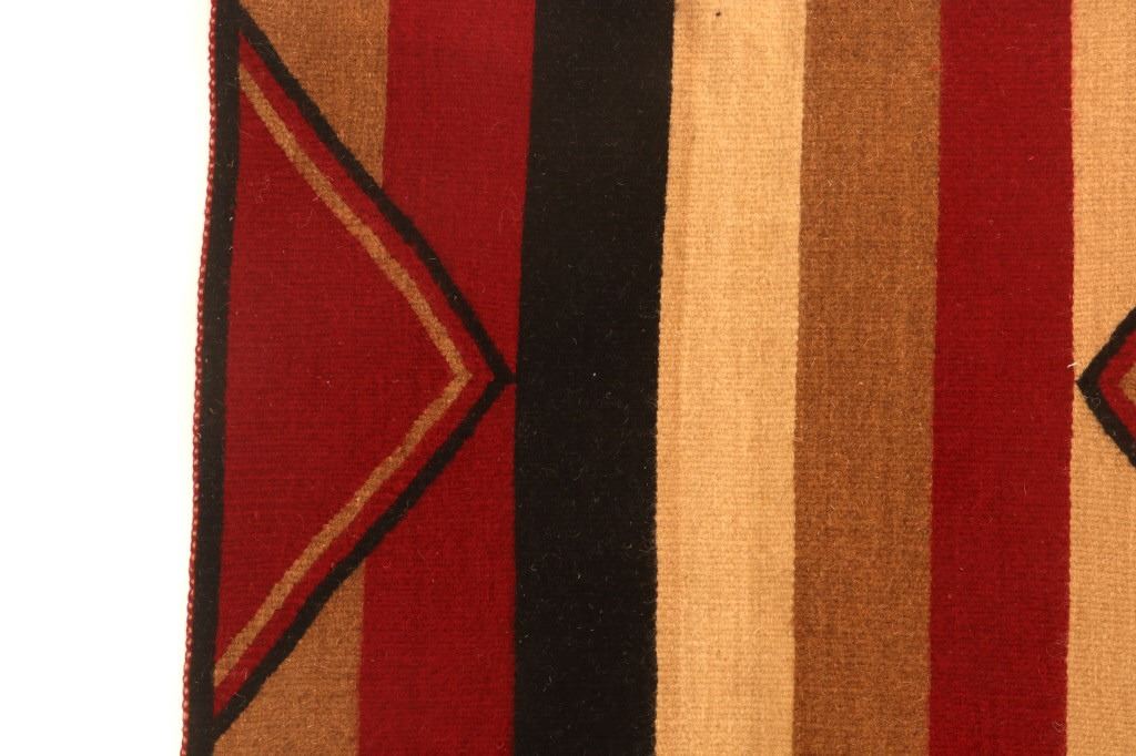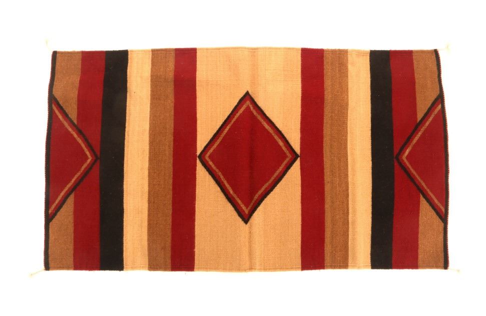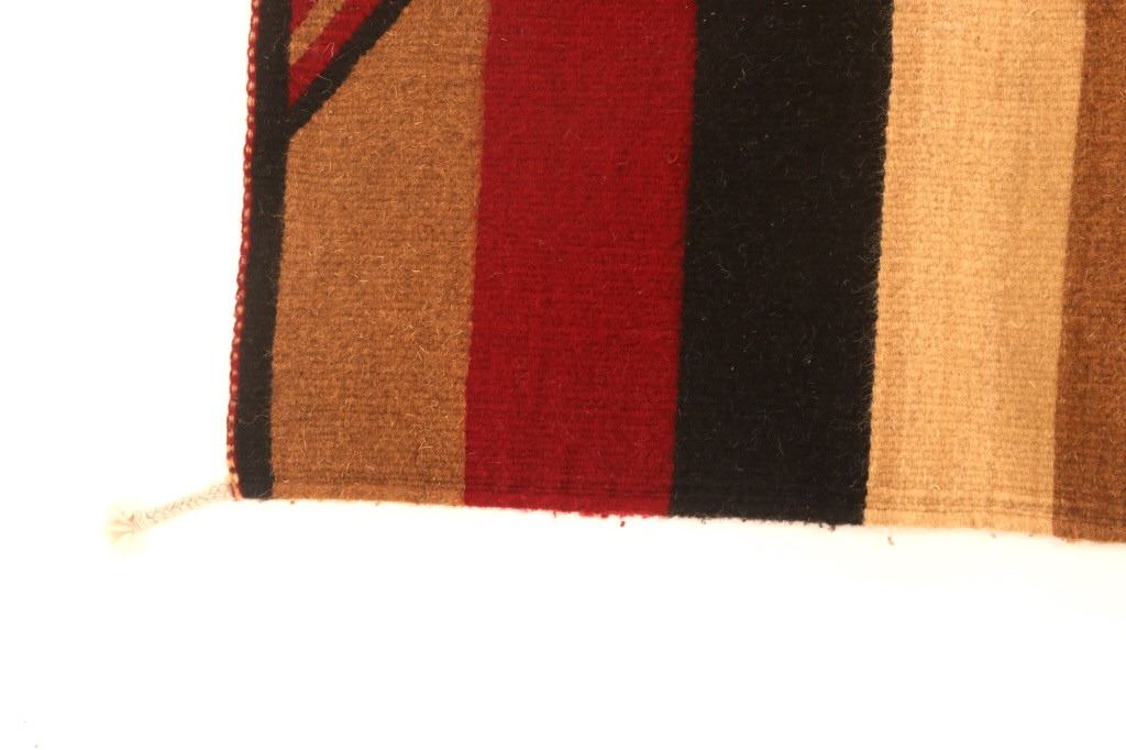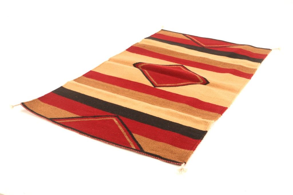 This is an excellent, hand woven flat weave rug by master weaver Diego Ruiz. It was made using 100% soft, fine, hand spun yarns in a beautiful Ganado Promontory pattern. The rug was hand woven with a tight weave of 100% hand spun wool yarns, which offers natural variegation and durability with color fast aniline dyes. The tight hand-woven weave displays bright, rich tones in the fine Promontory pattern of the time-honored Zapotec, multi-generational craft by a master weaver, Diego Ruiz. The rug shows a phenomenal, Navajo-like Ganado pattern, which is of the historic Lorenzo Hubbell Trading Post days of the 1800’s, with modern contemporary detail showing a light brown, black, and red heathered banded background and large diamond pattern. It is finished by the bands of color on each end. The bottom and top ends of the rug are profusely decorated with a tri-braided end weave that is finished with tassels. The piece is brand new, in pristine condition, with a fine, tight weave; it is one of the nicest rugs shown in this auction. The rug measures 2.5’ by 5' (2.5 foot by 5 foot). This is a brand-new rug.