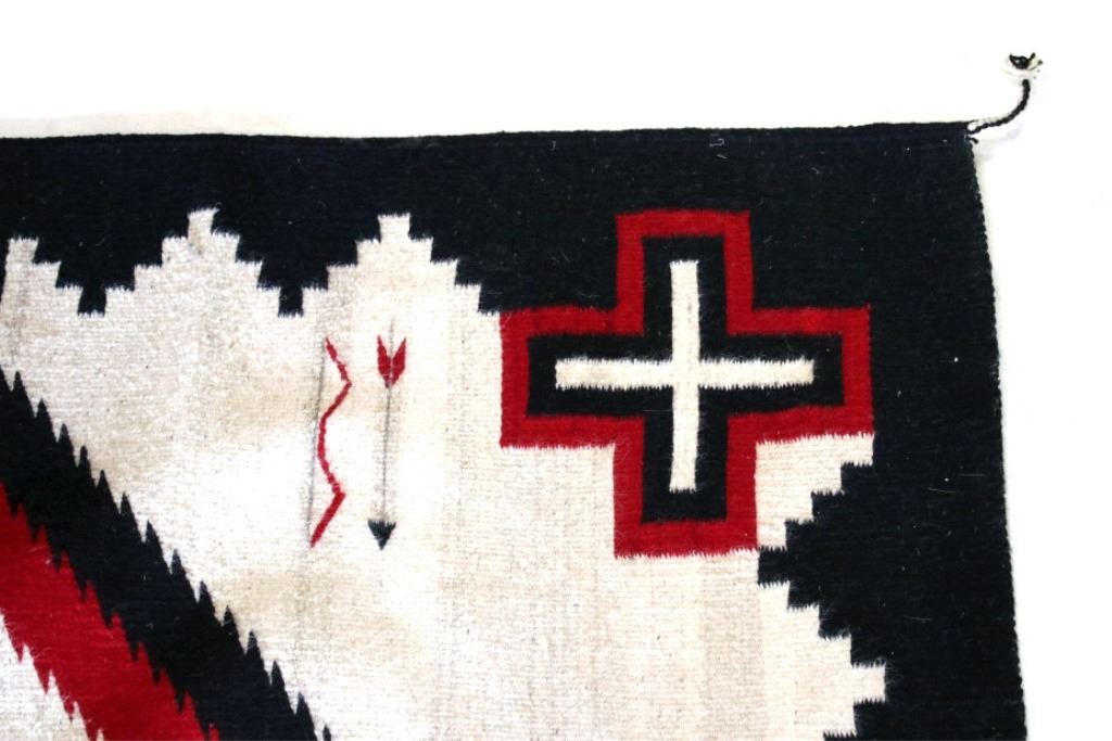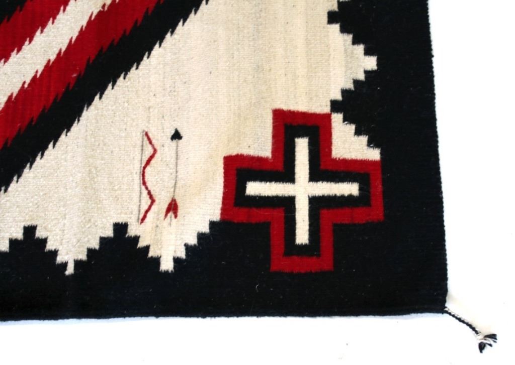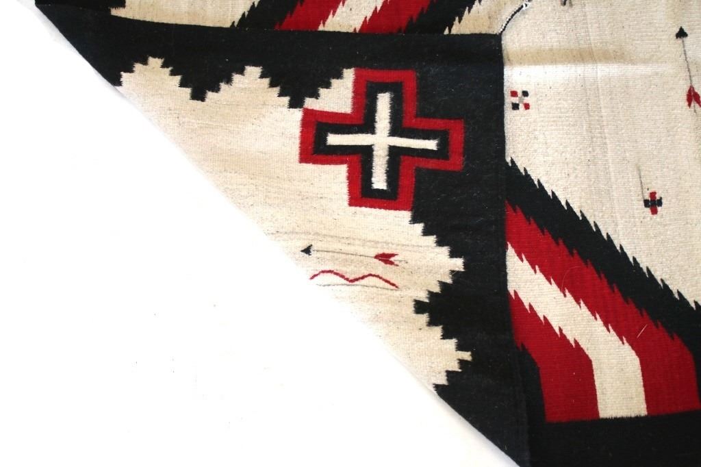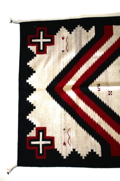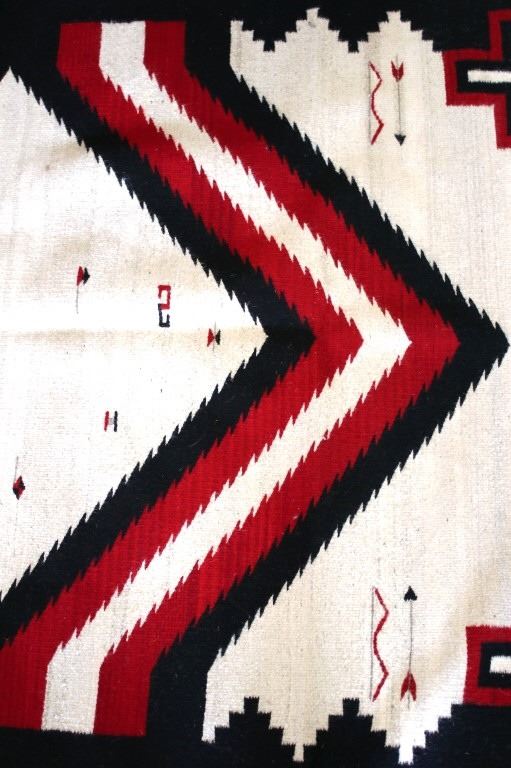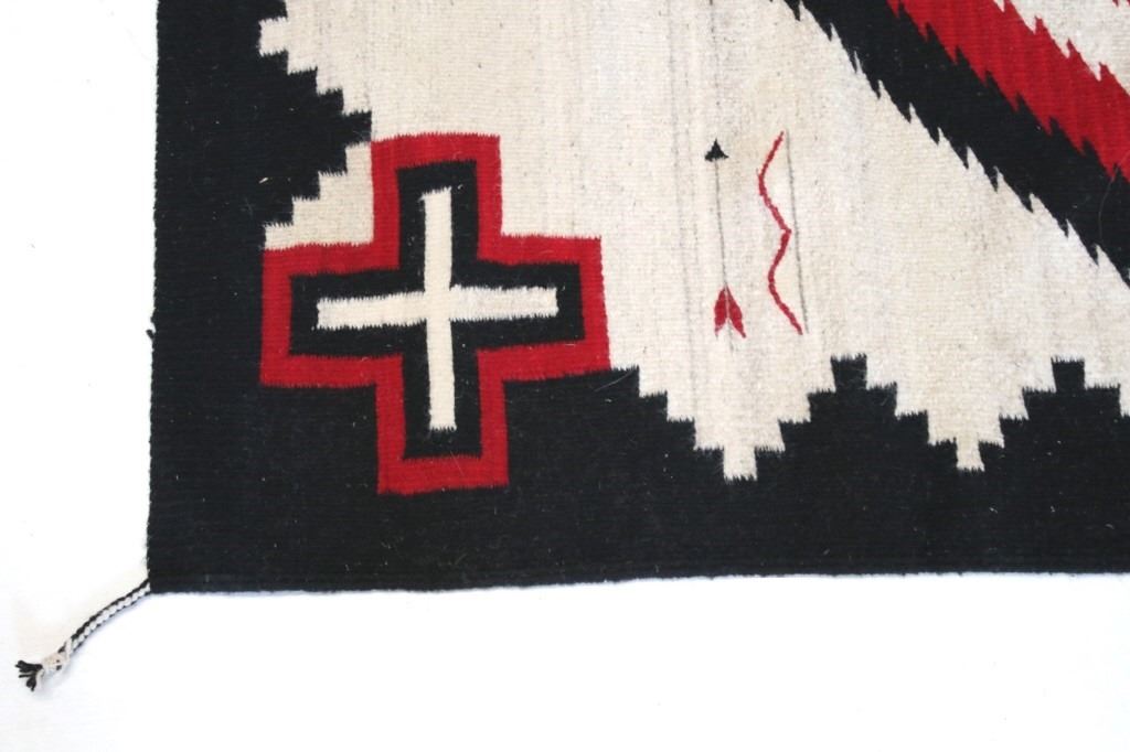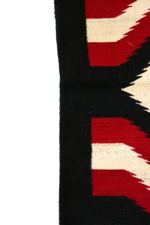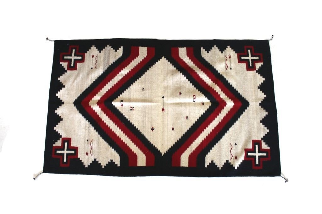 This is an excellent handwoven flat weave rug by master weaver Luis Hernandez using 100% soft fine handspun yarns in a beautiful Promontory pattern. The rug was handwoven with a tight weave using 100% handspun wool yarns that offers natural variegation and durability with color fast aniline dyes. Tight handwoven weave displayed with bright rich tones in the fine Promontory pattern in the time-honored Zapotec multi-generational craft by a master weaver, Luis Hernandez. The rug shows a phenomenal Navajo like Ganado pattern of the historic Lorenzo Hubbell Trading Post days of the 1800’s with modern contemporary detail showing a cream heathered background, with large diamond pattern at the center in bold lines of red, black and cream / white showing four four-point cross symbols (one in each corner) of the and finished by the bands of color on each end. The piece is brand new in pristine condition with fine tight weave. The rug measures 4’ by 6’ 6” (4 foot by 6 foot 6 inches). This is a brand-new rug.