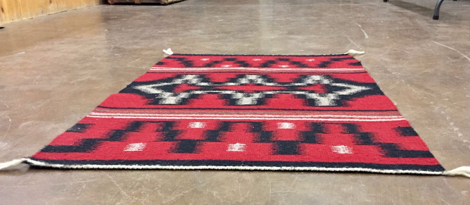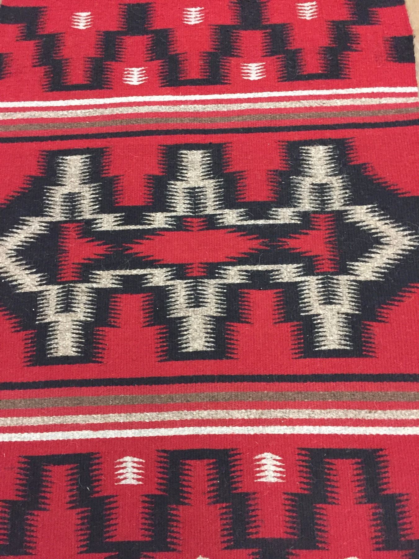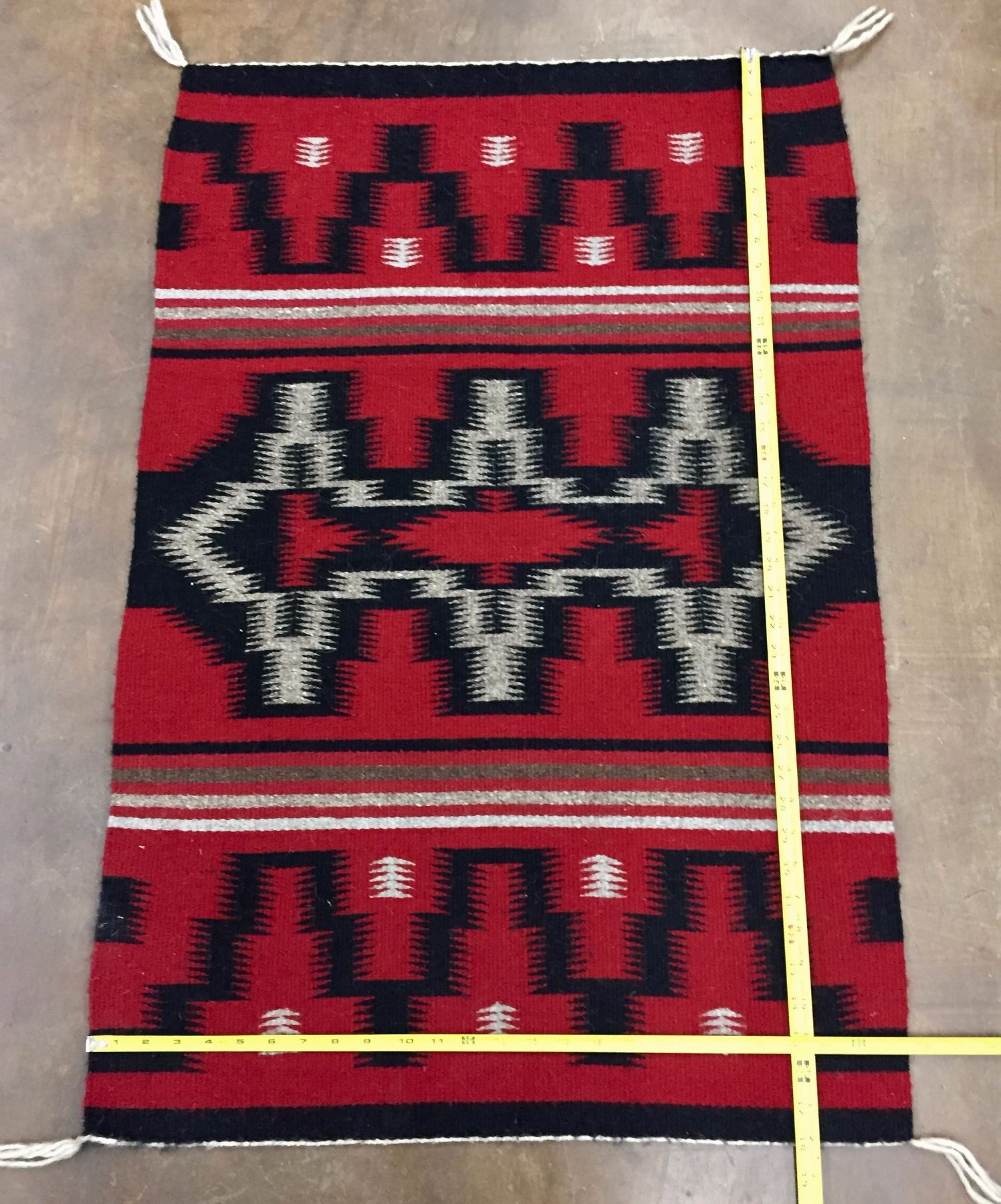 Description: Ganado red Navajo textile with geometric patterns. Maker: Unknown Navajo weaver. Approx. Age: Circa 1970s. Size: Measures 25 1/2" w x 38" long. Condition: Good for its age, normal wear expected. Please look closely at the pictures - they are an important part of our description. Shipping: There will be a $5 handling / packaging fee for shipping this lot. The actual cost of postage will be added on top of that.