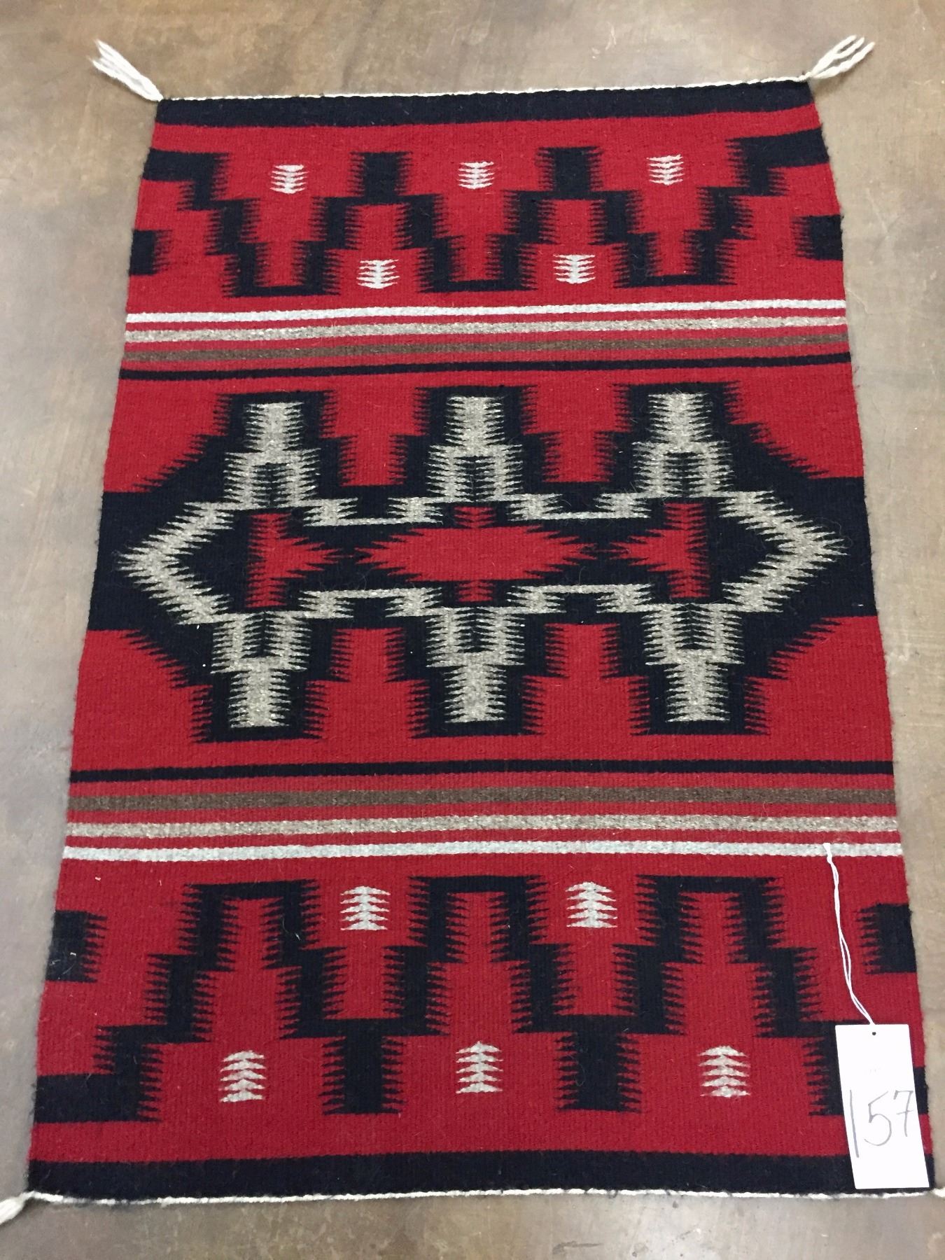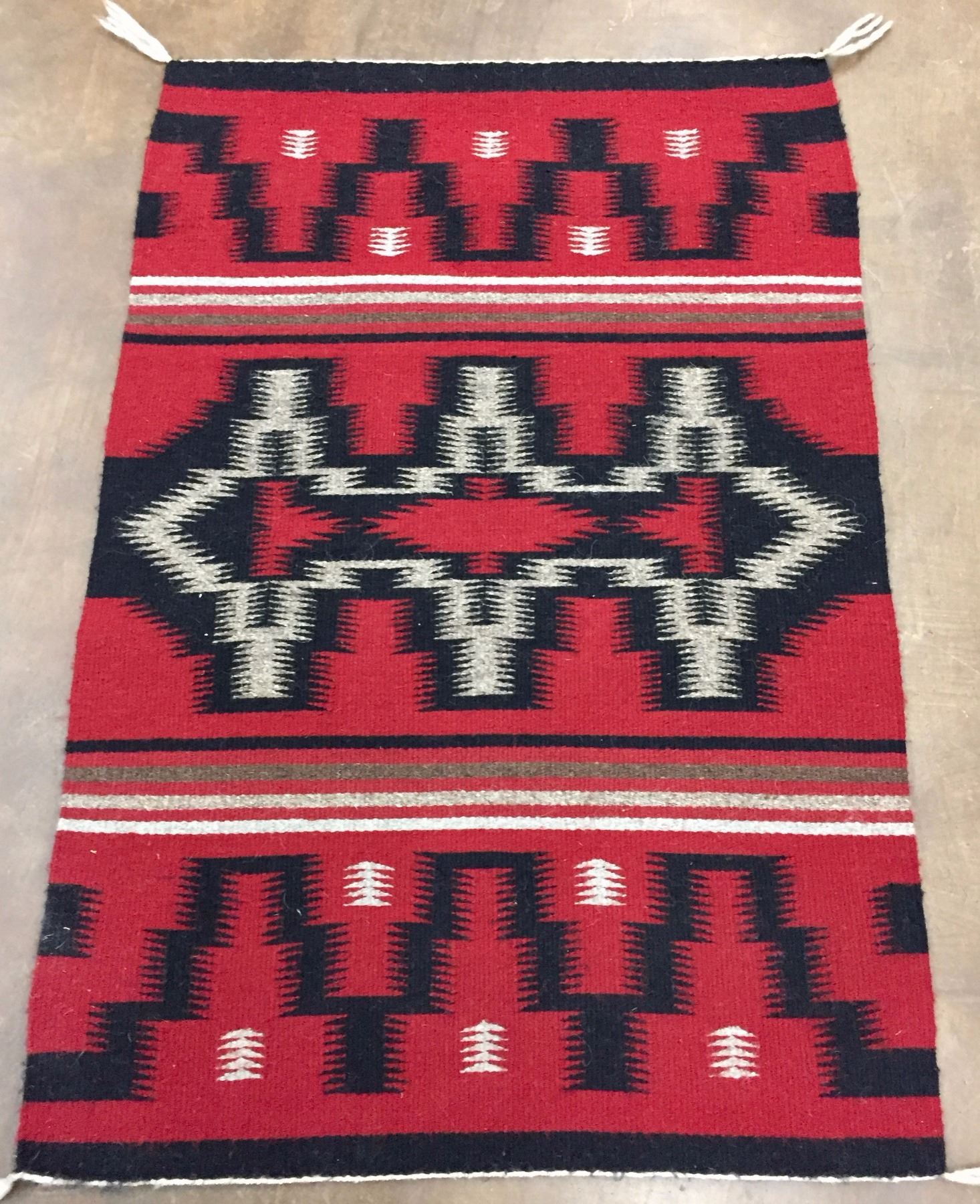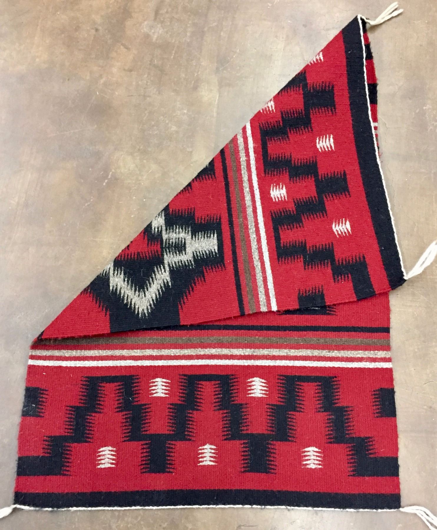 Description: Ganado red Navajo textile with geometric patterns. Maker: Unknown Navajo weaver. Approx. Age: Circa 1970s. Size: Measures 25 1/2" w x 38" long. Condition: Good for its age, normal wear expected. Please look closely at the pictures - they are an important part of our description. Shipping: There will be a $5 handling / packaging fee for shipping this lot. The actual cost of postage will be added on top of that.