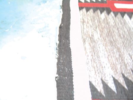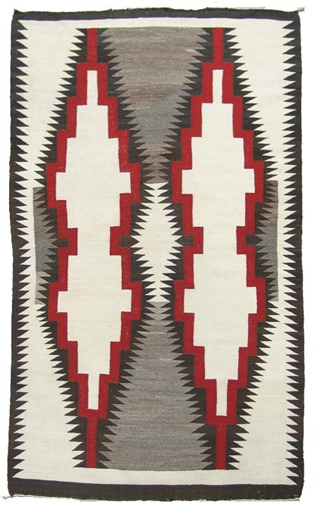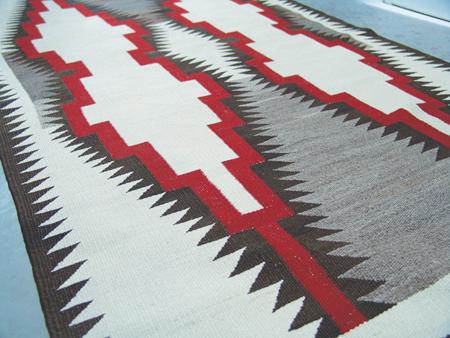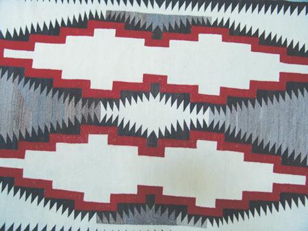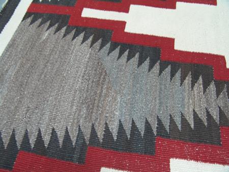 Red, black, and white rug with serrated diamond design. 6' x 3'6"