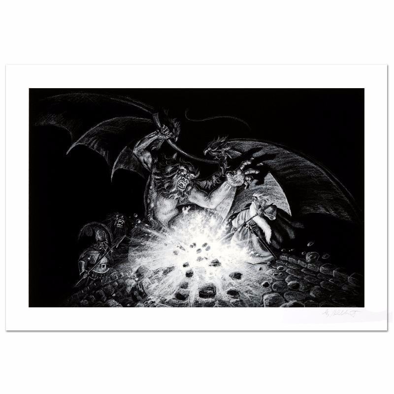 Known world wide for his fantasy and science fiction illustrations, Greg Hildebrandt has created an abundance of fascinating artwork including, and most notably his illustration work for J.R.R. Tolkien's 'The Hobbit' and 'Lord of the Rings'. "Gandalf Versus Balrog", originally created in the 1970's for Ballantine Books, is a limited edition giclee on paper, numbered and hand signed by Greg Hildebrandt! Includes Certificate of Authenticity! Measures approx. 34" x 23.5" (with border), 30" x 19.5" (image). Retail Price $995.00. PRICE INCUDES FREE SHIPPING IN THE U.S. - SHIPPING WILL BE ADDED TO YOUR INVOICE FOR ALL BUYERS OUTSIDE OF THE U.S.