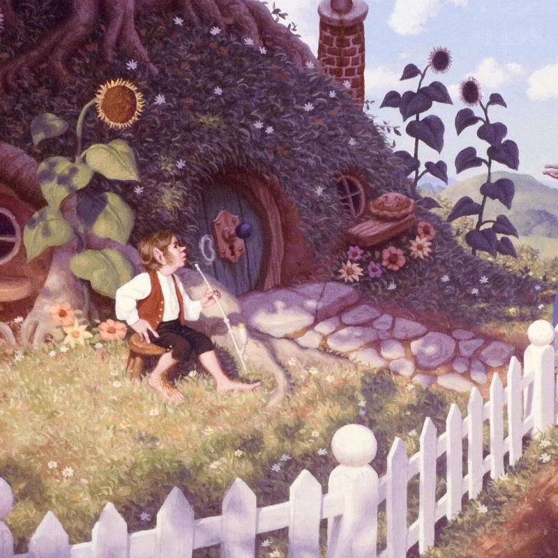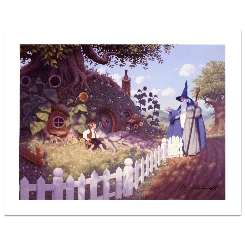 Known world wide for their fantasy and science fiction illustrations, identical twin brothers Greg and Tim Hildebrandt created an abundance of fascinating artwork, most notably their illustration work for J.R.R. Tolkien's 'The Hobbit' and 'Lord of the Rings'. "Gandalf Visits Bilbo", originally created in the 1970's for Ballantine Books, is a limited edition giclee on canvas, numbered and hand signed by Greg Hildebrandt! Includes Certificate of Authenticity! Measures approx. 28" x 21" (image).
