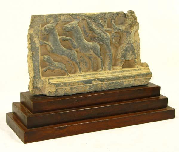 Ancient Gandharan frieze sculpture estimated to be carved during the 1st to 3rd century A.D. From the Gandharan region in northwest Pakistan, with provenance from Benjamin H. Oehlert, Jr., former U.S. Ambassador to Pakistan. Grey schist sculpture portrays a hunter adorned in a robe and skirt behind a tree, aiming a bow and arrow at two prancing horses and a dog on its hind legs. Attached to a wooden base with three one-inch high steps. Sculpture measures 1.75'' deep, and 10.25” x 6.5”, which includes a 1.5” schist base.