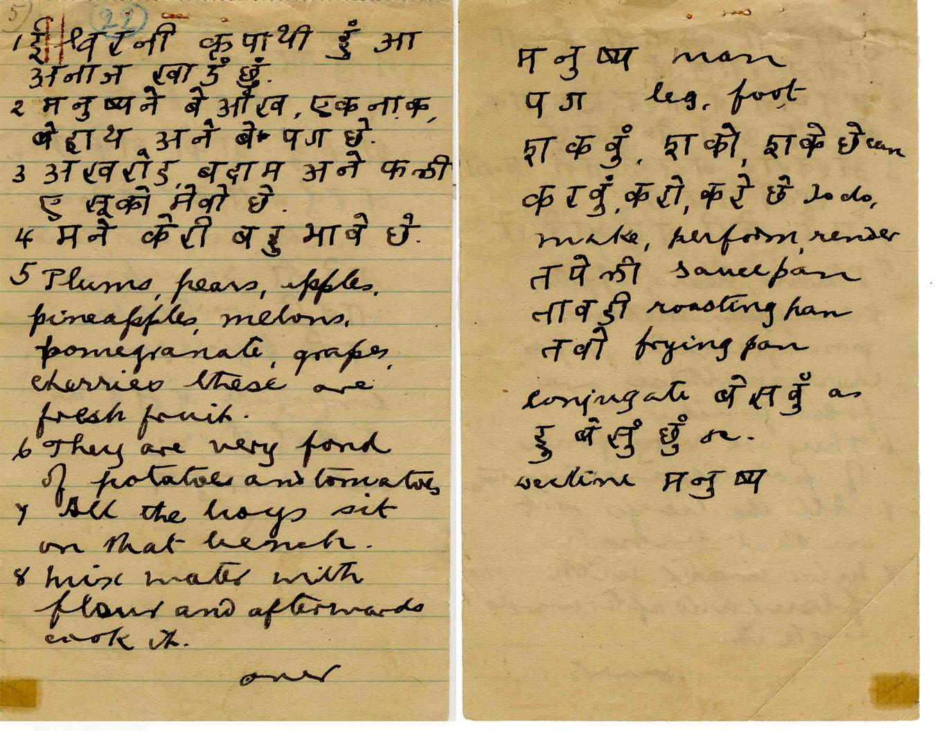 Mahatma Gandhi's personal notebook page written while in London, circa 1888-9, wherein Gandhi taught himself to speak English. Handwritten in black ink, both in Hindi and in English. Reads in part: ''5. Plums, pears, apples, pineapples, melons, pomegranate, grapes, cherries, these are fresh fruit. 6. They are very fond of potatoes and tomatoes. 7. All the boys sit on that bench. 8. mix water with flour and afterwards cook it…'' One page written on recto and verso, measuring 3.75'' x 6.25''. Tiny spot of discoloration and minute crease to lower left margin, staple holes to top margin, otherwise fine condition.