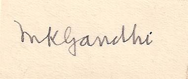 Rare signature, ''M K Gandhi'' boldly penned in black fountain pen on a slightly irregularly cut slip, approximately 2'' x 1''. The slip has been glued to a slightly larger piece of clipped card stock which has been annotated by the original collector. Although small, the signature is perfectly clean and bold, and well centered on the paper for matting purposes.