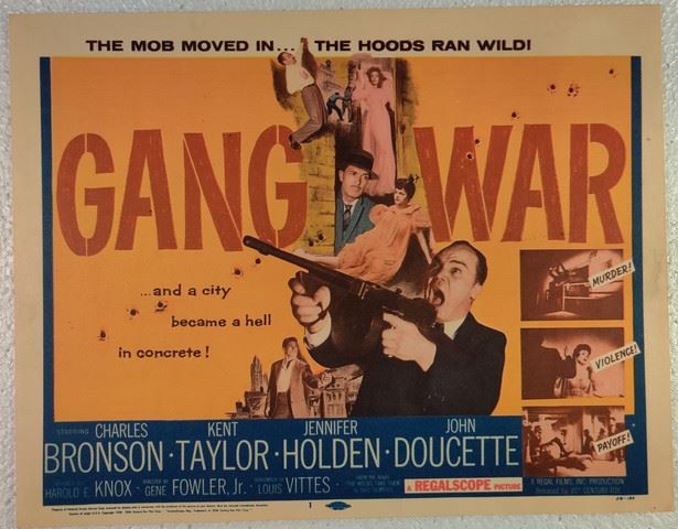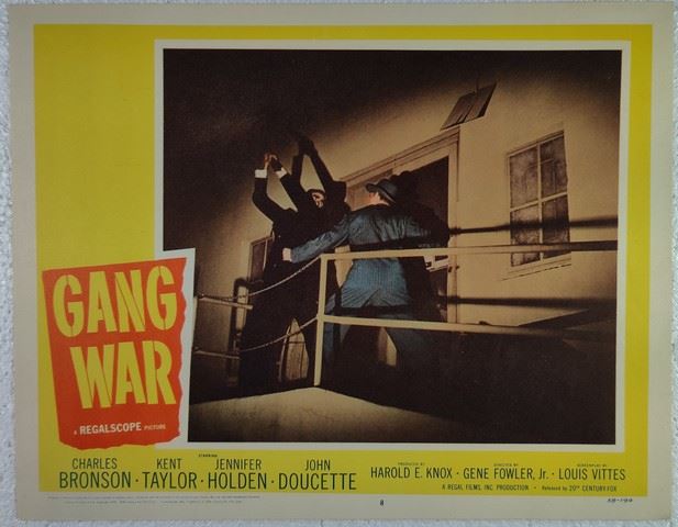Gang War (Regal Films, 1958) lobby card. Drama, Crime. Starring Charles Bronson, Kent Taylor, Jennifer Holden, John Doucette, Gloria Henry, Ralph Manza, Gloria Grey, Barney Phillips, George Eldredge, Billy Snyder, Lyn Guild, Dan Simmons, Jack Reynolds, Jack Littlefield, Larry Gelbman, Shirley Haven, Ed Wright. Directed by Gene Fowler, Jr. Very light edge wear, very light creases. Near Mint. (11"x14").