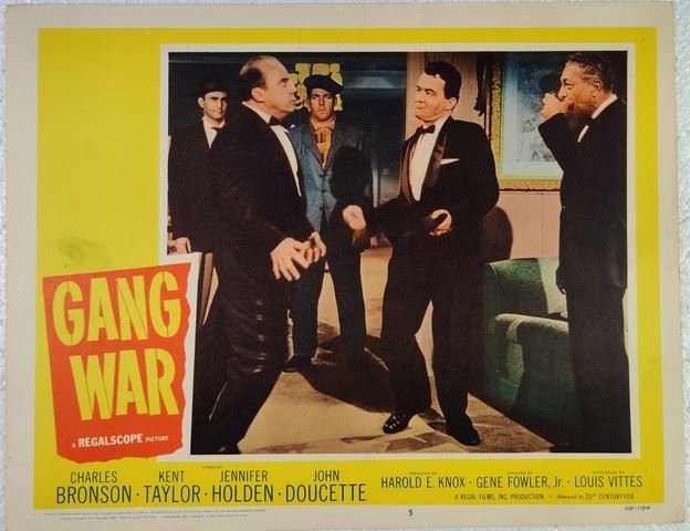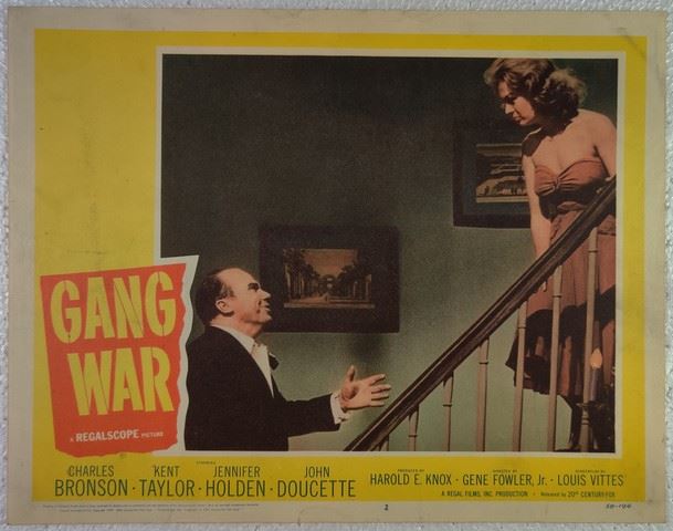 Gang War (Regal Films, 1958) lobby card. Drama, Crime. Starring Charles Bronson, Kent Taylor, Jennifer Holden, John Doucette, Gloria Henry, Ralph Manza, Gloria Grey, Barney Phillips, George Eldredge, Billy Snyder, Lyn Guild, Dan Simmons, Jack Reynolds, Jack Littlefield, Larry Gelbman, Shirley Haven, Ed Wright. Directed by Gene Fowler, Jr. Very light edge wear, very light creases. Near Mint. (11"x14").