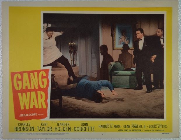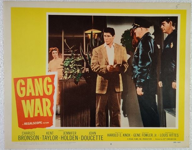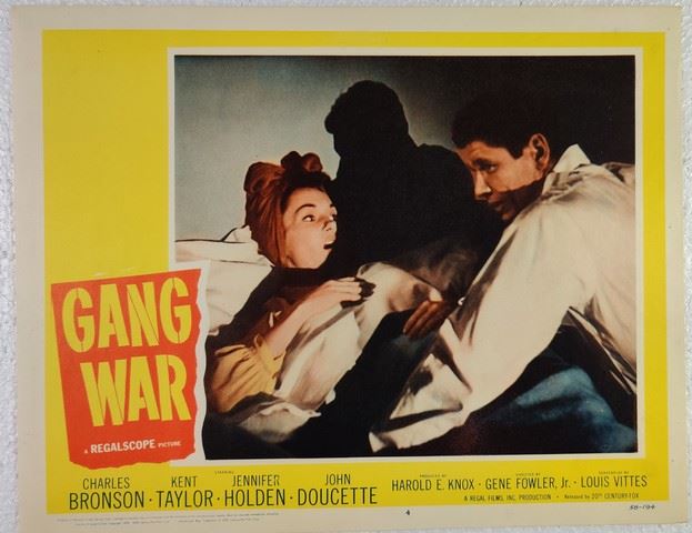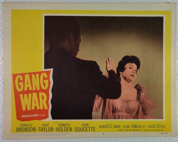 Gang War (Regal Films, 1958) lobby card. Drama, Crime. Starring Charles Bronson, Kent Taylor, Jennifer Holden, John Doucette, Gloria Henry, Ralph Manza, Gloria Grey, Barney Phillips, George Eldredge, Billy Snyder, Lyn Guild, Dan Simmons, Jack Reynolds, Jack Littlefield, Larry Gelbman, Shirley Haven, Ed Wright. Directed by Gene Fowler, Jr. Very light edge wear, very light creases. Near Mint. (11"x14").