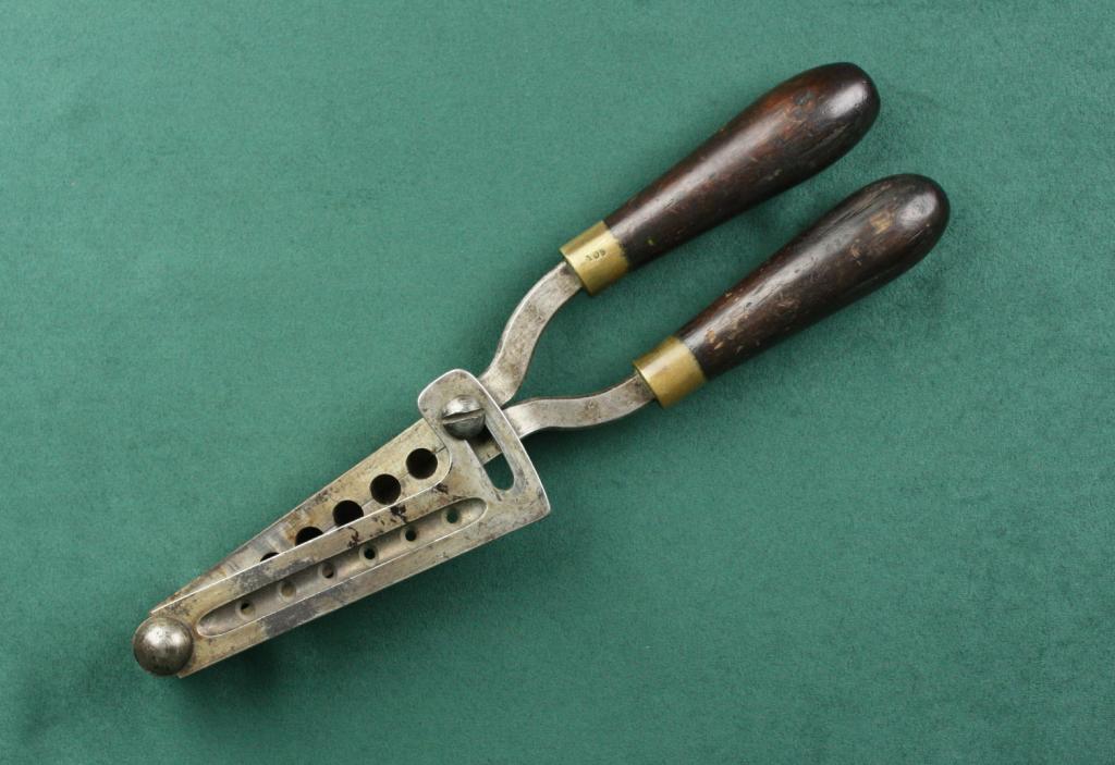 Gang bullet mold with wood grips, inspector marked “A.H.K.” in overall very good condition, six cavity conical bullets. Est.: $300-$500.