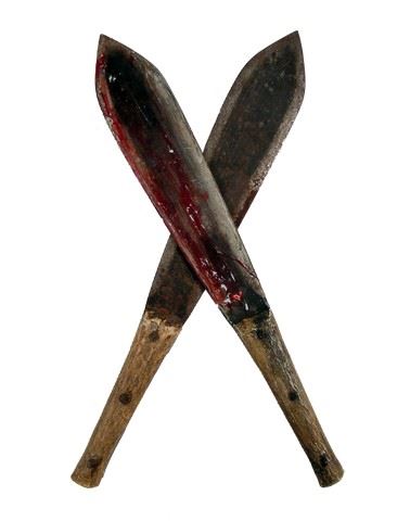 Gangs Of New York Screen Used Battle Knives Props - Director Martin Scorsese has admitted that even though his epic masterpiece "Gangs of New York" (2002) is about the famous wars between different generations of Irish immigrants in 1863 in the Five Points area of New York City, the film itself slowly took on the look and feel of a Sergio Leone or even a Fellini film. This was due in part because many of the crew worked with both of these legendary directors, as well as the fact that most of the New York streets and interiors were filmed at Cinecitta Studios in Rome, where both these, as well as other great Italian directors worked through the years. Of course the two most impressive sequences are the two gang wars, one at the opening of the film, and the other at the end pitting Amsterdam Vallon (Leonardo Di Caprio), against the leader of the rival gang who killed Vallon's father, Bill "the Butcher" Cutting (Daniel Day-Lewis). Never before has such fight sequences been filmed in this manner showing painful and bloody realistic shots of exactly what it is like for hordes of angry men (and women) to fight each other with whatever weapons they can find, including mostly handmade knives, axes and swords. These are two screen used knives from these sequences. They come from the personal collection of Gennaro Avvisato who was one of the prop masters in these fight sequences. One of the knives has also been "art directed" by Avvisato with blood stains. Pair of screen used knives are approx 16" long.