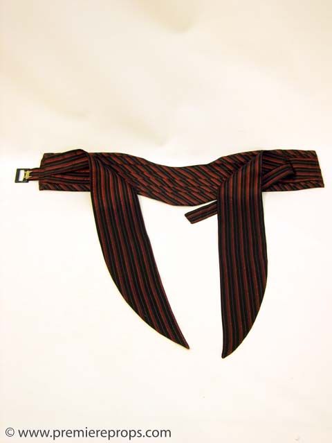 GANGS OF NEW YORK - “Native Americans” Black & Red Cravat - A black and red striped silk cravat, featuring a buckle closure on the back, and two ribbon ties at the front. The cravat measures 24” x 3” excluding the ribbons. The gang affiliation, actor's name, “Liam Carney,” and scene numbers are written on a tag sewn to the vintage necktie. The perfect MIRAMAX prop to display in your authentic memorabilia collection!!