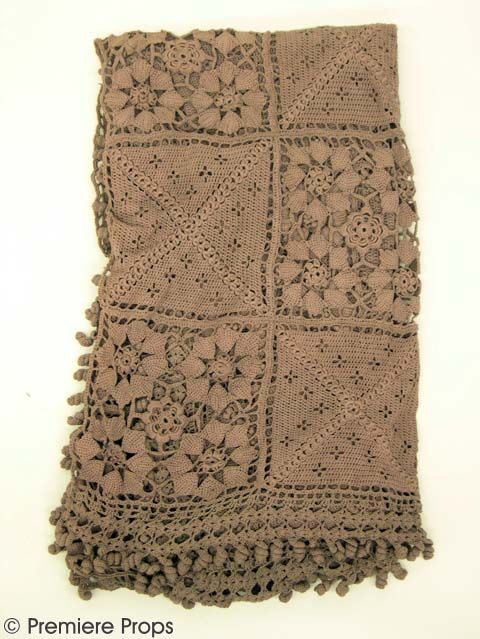 GANGS OF NEW YORK - Intricate Lavender Shawl - A beautiful and intricately crafted lavender shawl, featuring alternating squares of a simple woven design and a detailed flower pattern thinly connected to the rest of the 4' square garment. The shawl has gotten fairly dirty around the border, which features thick, braided lavender tassel fringe hanging off. This genuine MIRAMAX movie prop is a unique and distinctive find for true collectors!!