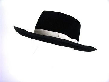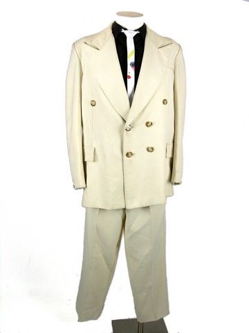 From New York Costume Designer Frankie Steinz: "Gangster"; White suit coat and pants; Black dress shirt (size 15-15 1/2 neck); White thin style tie with art design; prop revolver (broken hammer); over shoulder concealed holster; black fedora with white ribbon; dark gray shoe covers