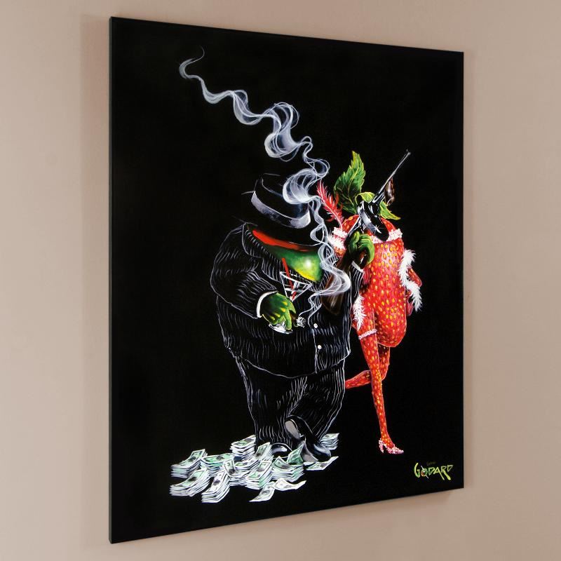 With unforgettable characters and undeniable charm, Michael Godard creates artworks that are sure to be the centerpiece of any room! "Gangster Love" is a limited edition hand-embellished giclee on stretched canvas, AP numbered and bears Godard's authorized signature! This piece comes gallery wrapped. Includes Certificate of Authenticity! Measures approx. 28" x 35" (image).