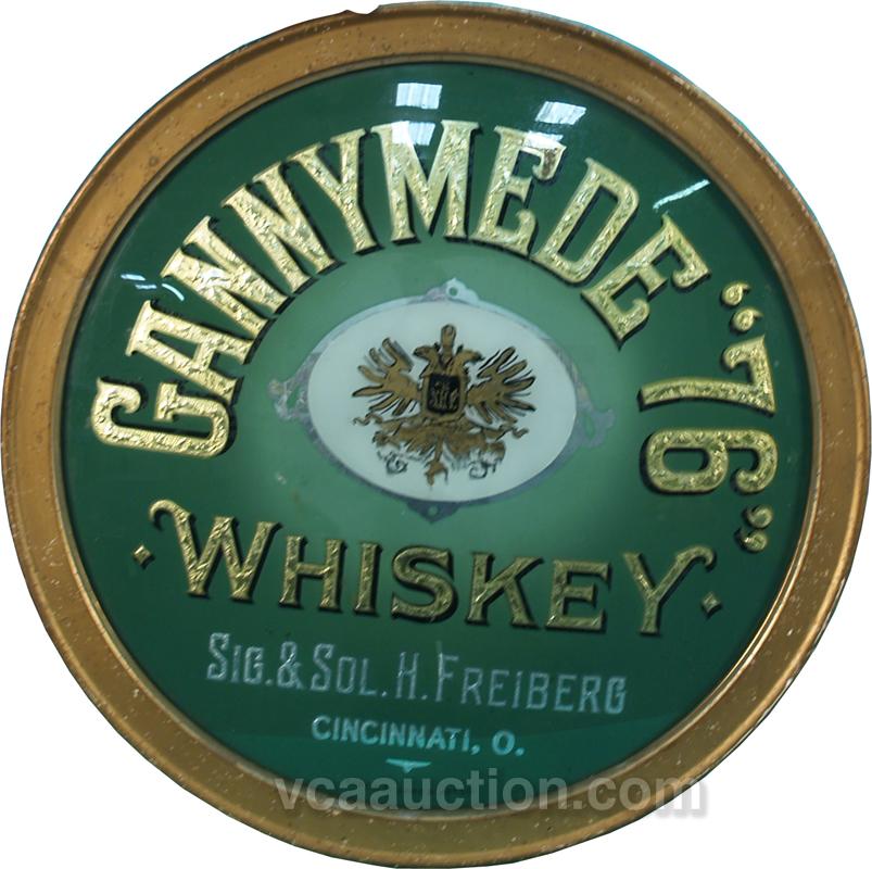 Gannymede "76" Whiskey Reverse Glass Sign, Sig. & Sol. H. Freiberg Cincinnati, O. in wood frame - 22" diam