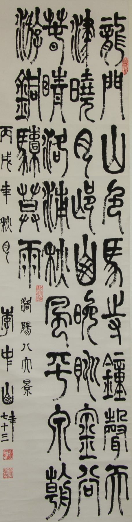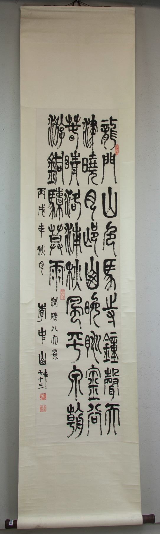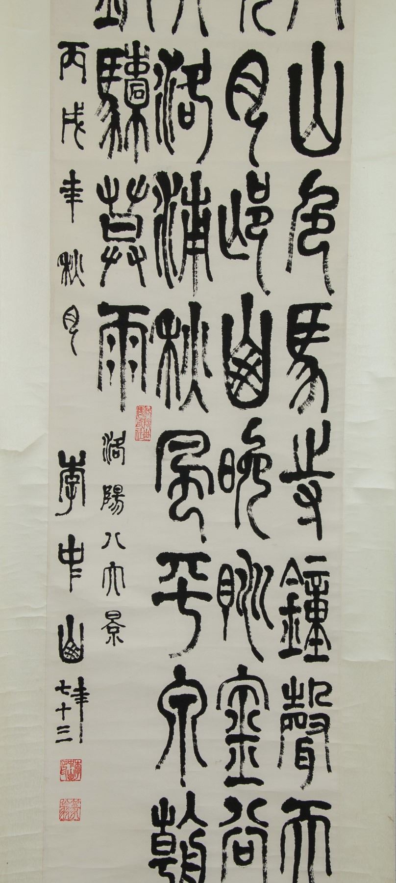 Chinese calligraphy in seal script; Chinese ink on paper; hanging scroll; signed Gao Huashan (b.1928); inscribed with 3 artist seals; 132 cm x 34 cm