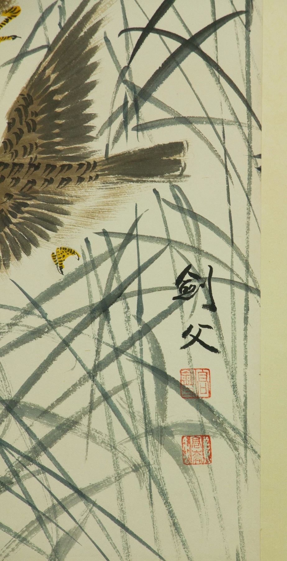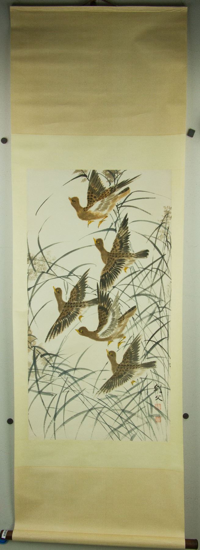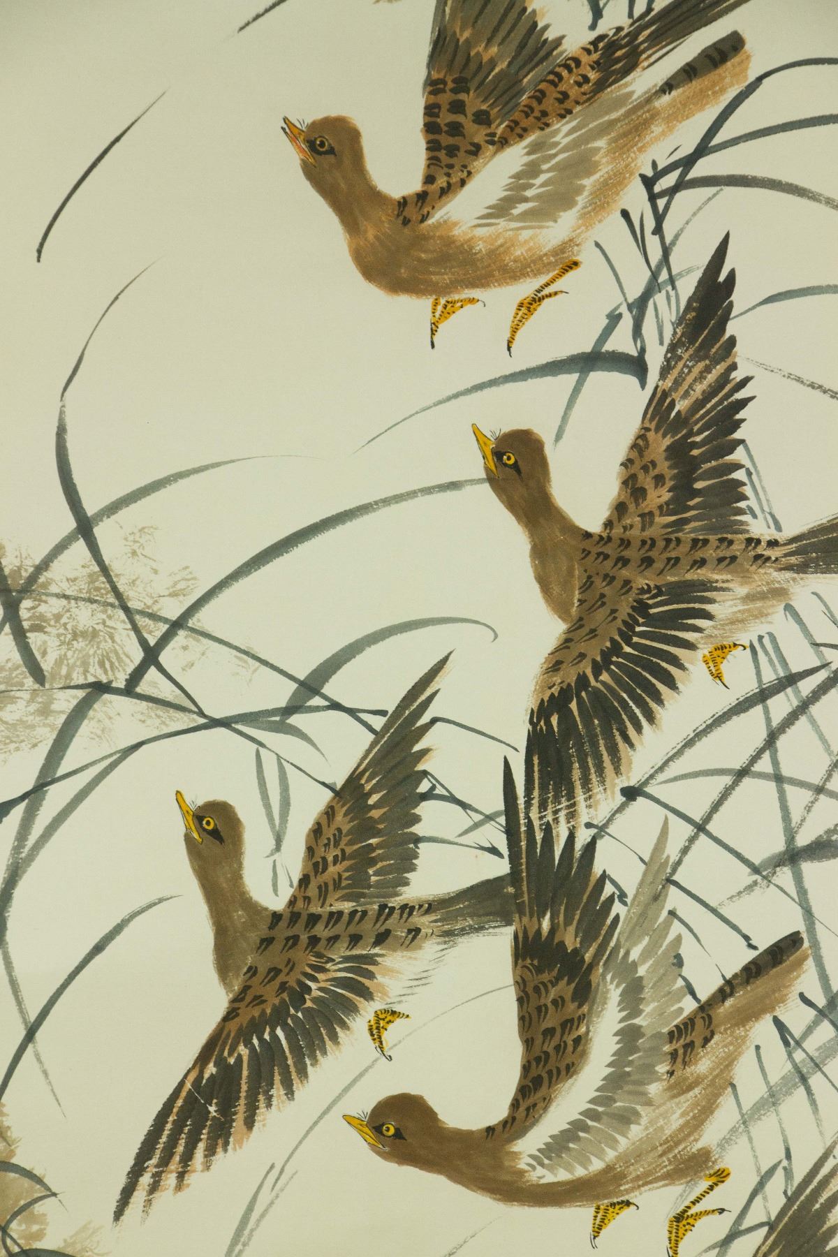 Wild geese amongst reed marshes; Chinese ink and watercolour on paper; hanging scroll; signed Gao Jianfu and inscribed with two artist seals; 175 cm × 54 cm
