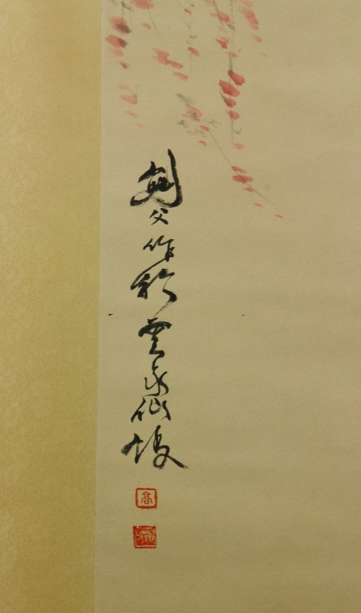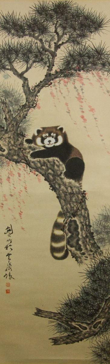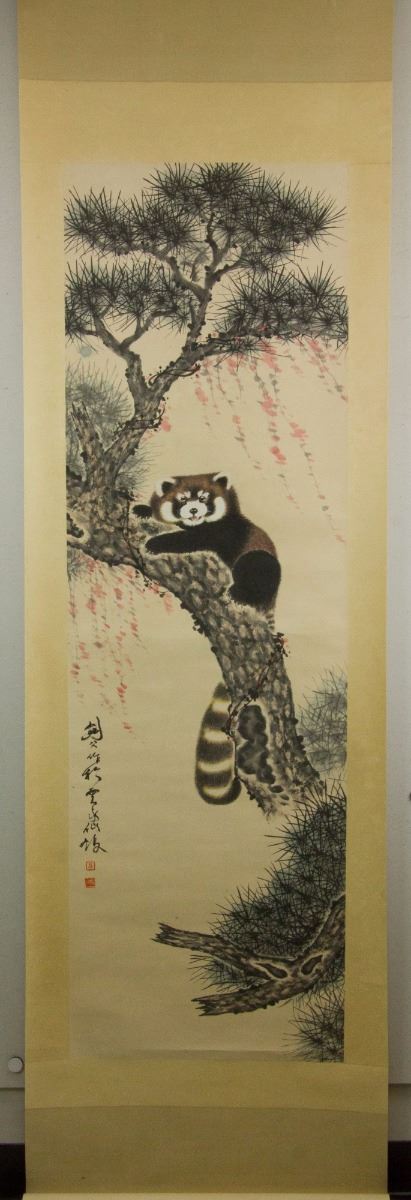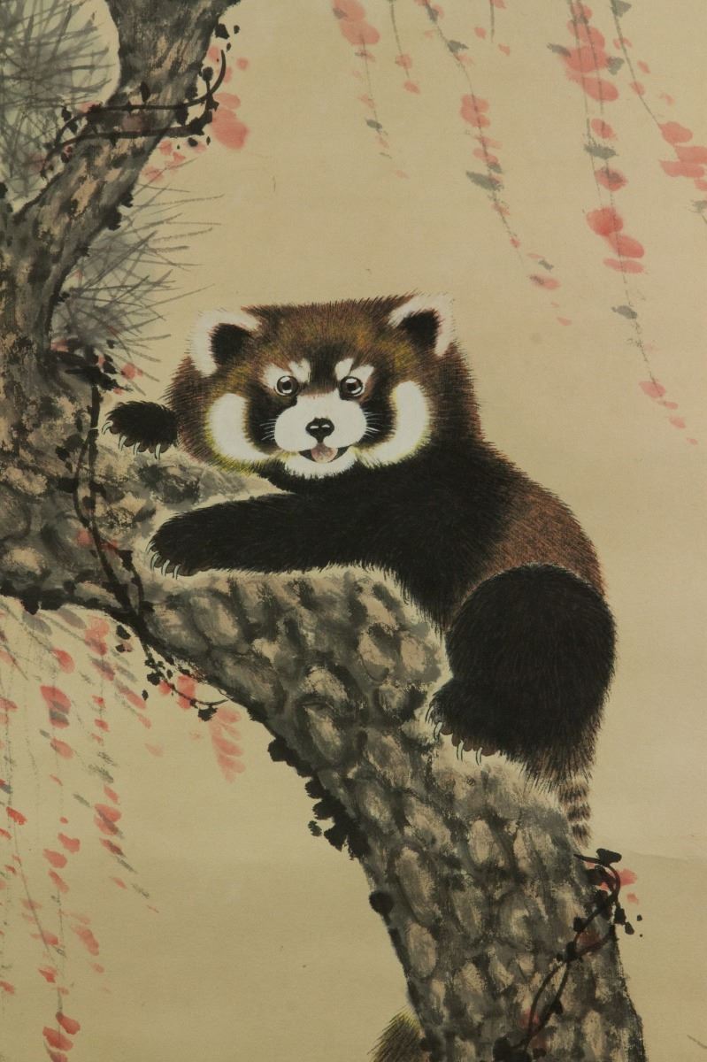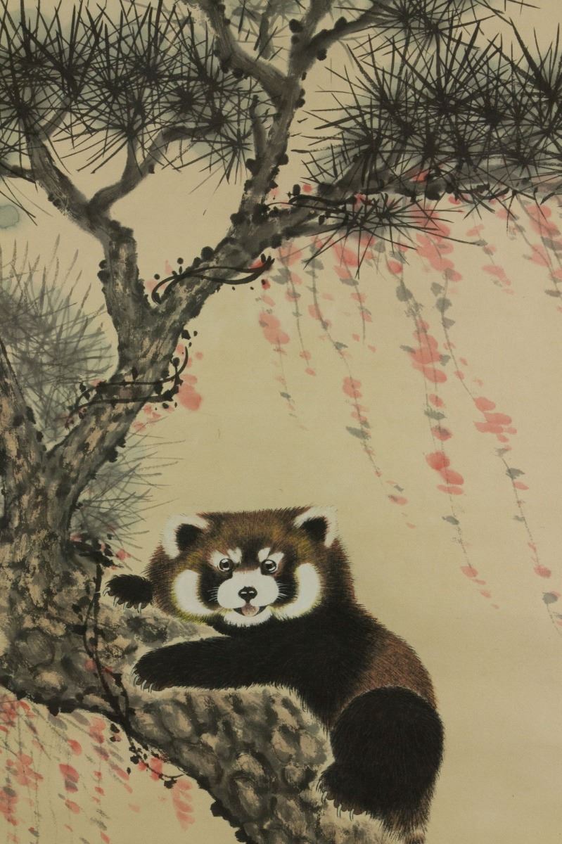 Chinese red panda climbing on tree; Chinese ink and watercolour on paper; hanging scroll; signed Gao Jianfu (1879-1951); inscribed with two artist seals; 151 cm × 47.5 cm