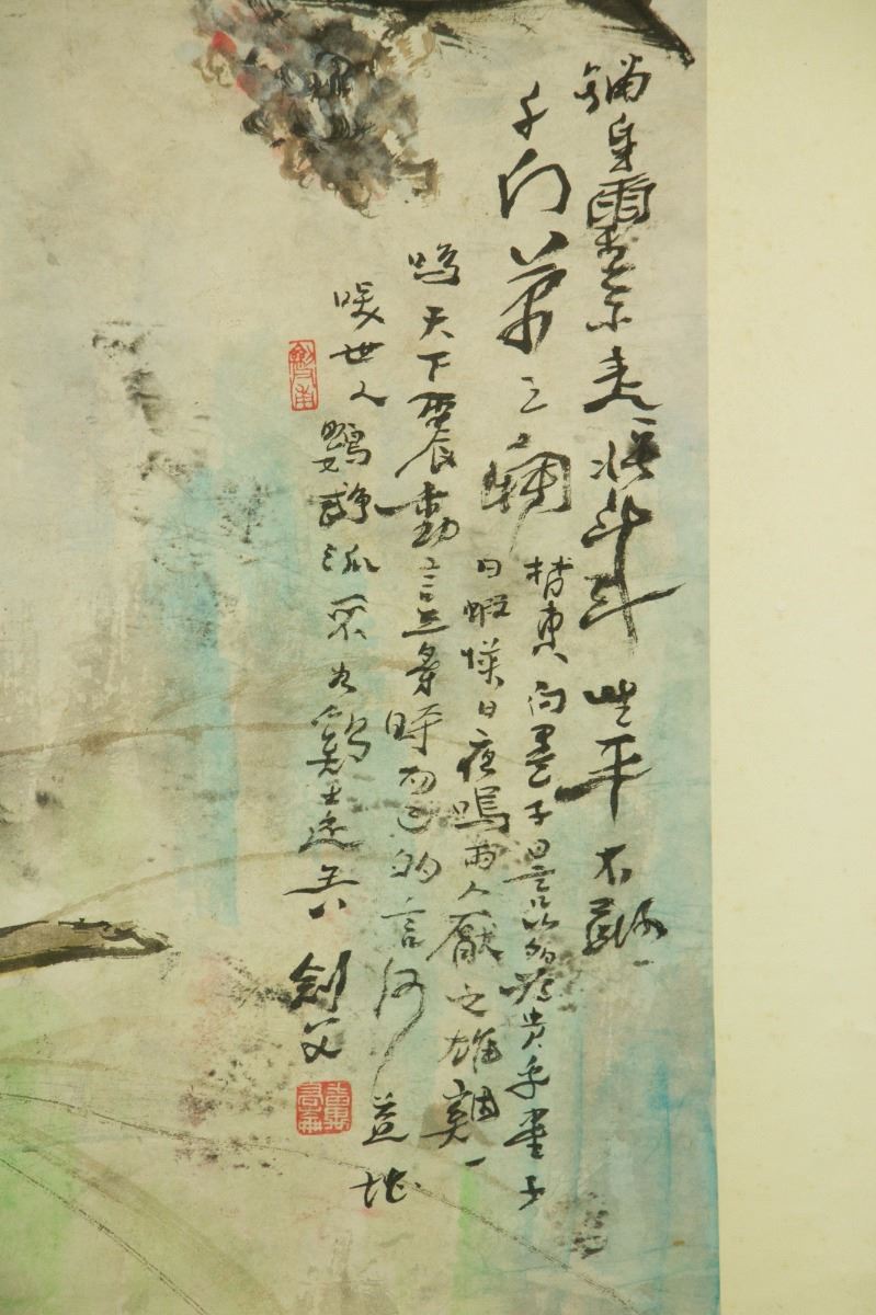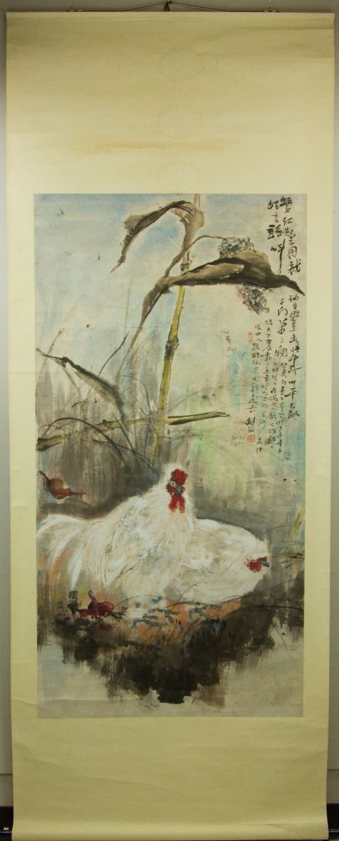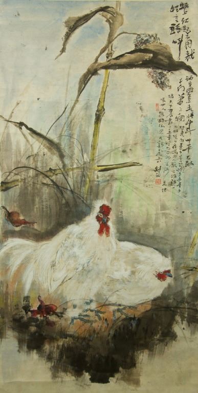 A pair of hens amongst reeds; Chinese ink and watercolour on paper; hanging scroll; signed Gao Jianfu (1879-1951); inscribed with two artist seals; 215 cm × 97 cm