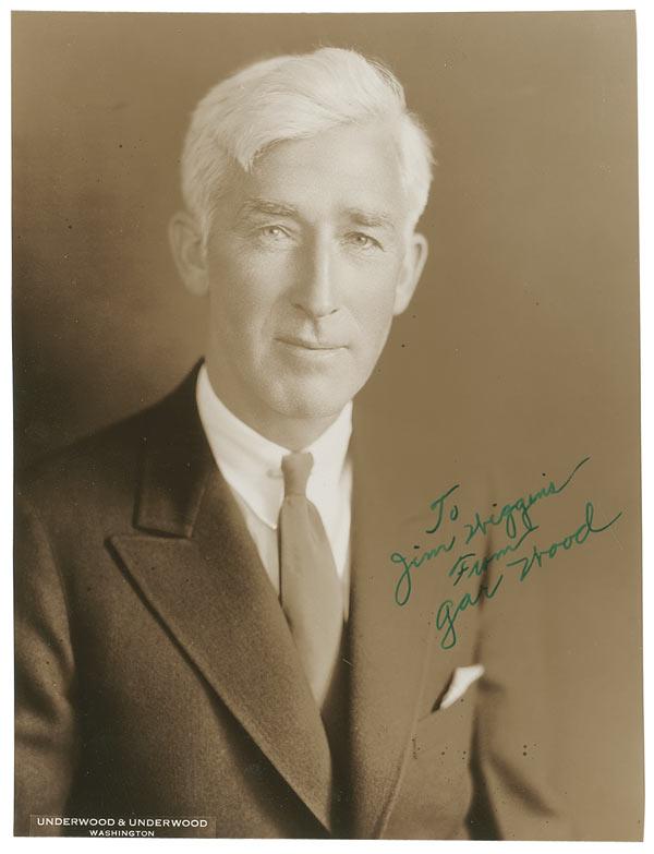 American inventor, entrepreneur, motorboat builder and racer (1880–1971) who held the world water speed record on several occasions. He was the first man to travel over 100 miles per hour on water. Vintage sepia glossy 7 x 9 Underwood and Underwood photo, signed and inscribed in green fountain pen “To Jim Wiggins From Gar Wood.” A couple of light bends and creases, a few faint scratches, a bit of rippling, trimmed edges, otherwise fine condition.