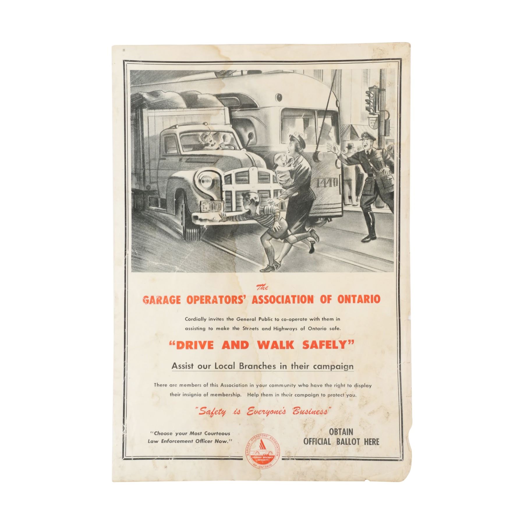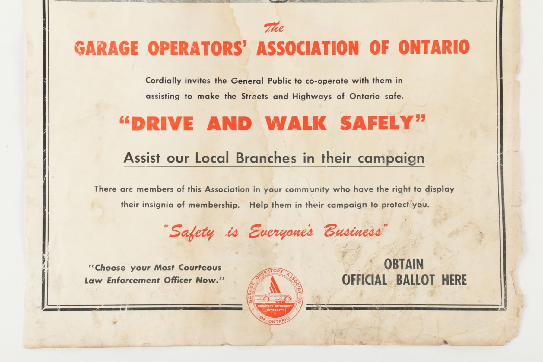 Canadian. Circa 1940. Garage Operators Association of Ontario. 19" x 13". Soiling, edge wear. Closed tears reinforced with tape from behind. $100-200.