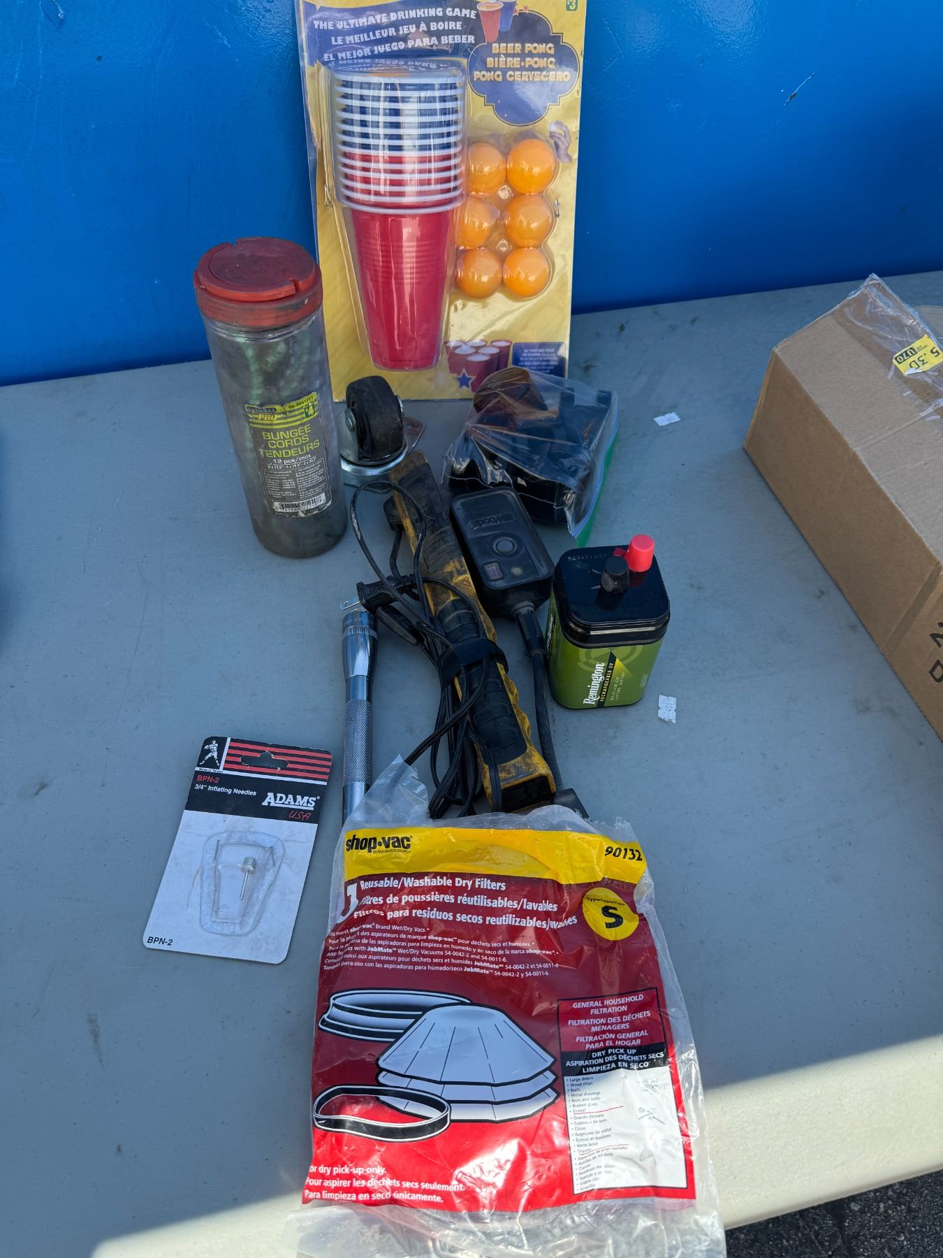 Garage items, bungee cords, beer, pong, light, etc.