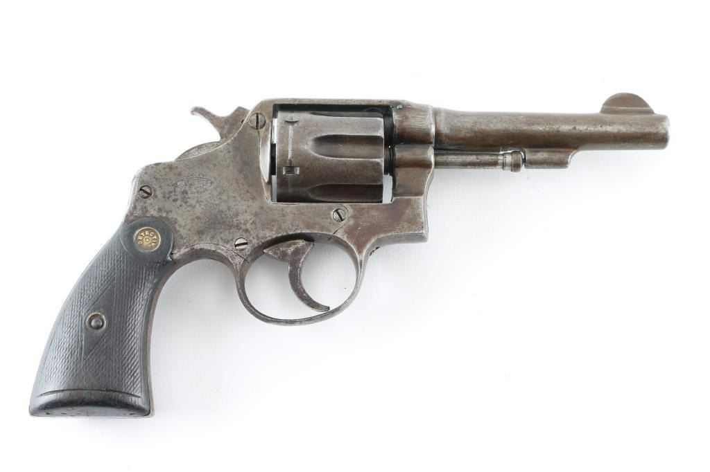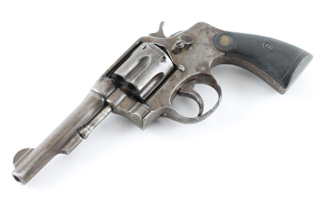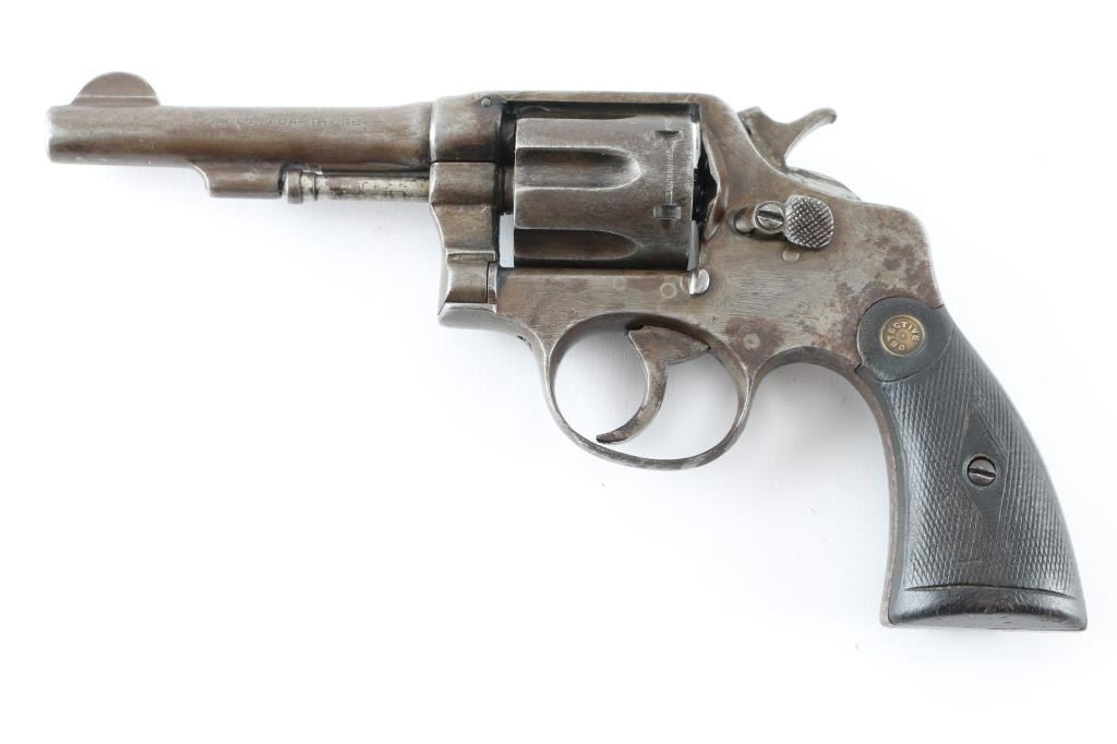 SN: 20471 Spanish made double action medium frame revolver, a close copy of the Smith & Wesson hand ejector 5-screw Military & Police revolver, with some internal changes. Features pinned 4-3/8" barrel with half moon front sight, fixed u-channel rear sight, 6 shot fluted cylinder, checkered wood "DETECTIVE" logo grips. Bore is fair condition, strong rifling, ring of corrosion close to muzzle. Metal surfaces show a mottled patina brown over some grayish metal, some patina or light pitting. Grips are good with small chips, no visible cracks, smoothing of checkered surface. Action is a bit stiff, timing is good, lock-up is fair or better. Barrel markings and "Detective" in oval on right side of frame are all readable. Condition is NRA Fair *** C&R Firearm ***