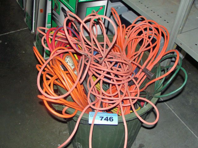 Garbage can filled with assorted extention cords and heavy duty power cords