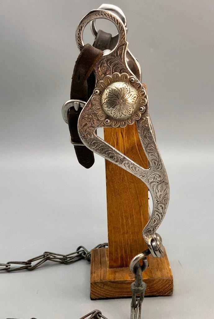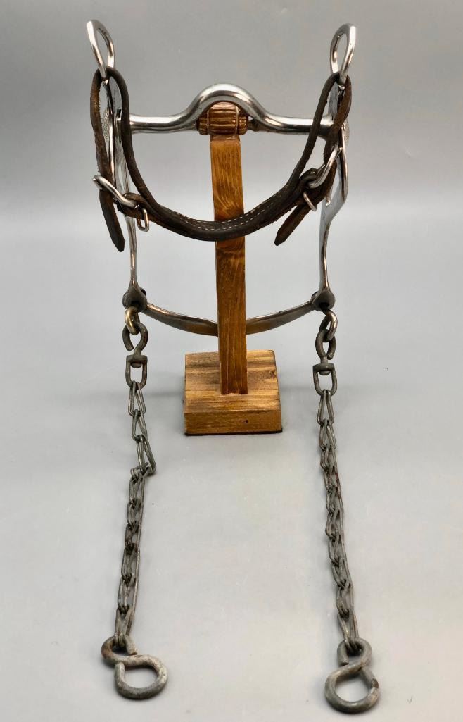 For sale in this lot is a Les Garcia bit that was used on Evel Knievel's horse at horse shows. The bit was owned and used by Judy Wright, a well known horse show judge, trainer and contestant (among others, she showed horses for Evel Knievel). Included is a photograph of Judy showing the horse and this bit is clearly in the horse's mouth. MAKER: Les Garcia. APPROX AGE: Circa 1960s -70. SIZE: Mouth is 5 inches. Overall is 8 inches. CONDITION: Good for its age, normal wear expected. Please look closely at the pictures as they are an important part of our description and are hereby incorporated into the description, specifically with regards to condition. SHIPPING: There will be a $5 handling / packaging fee for shipping this lot. The actual cost of postage will be added on top of that. BUY IT NOW: If you would like to buy this item now, without waiting for the auction day to bid on it, we do offer this option (which is available up to 48 hours before the actual auction starts). The “Buy it Now” price is the high estimate of this lot (plus applicable fees and the Buyer's premium is discounted to 10% when using the Buy it Now option). If you would like to exercise this option, you must contact us by email (or phone as long as you talk to someone live). Reference this lot number and your intention to "Buy it Now."