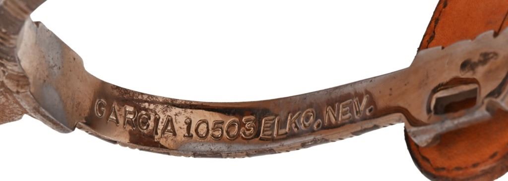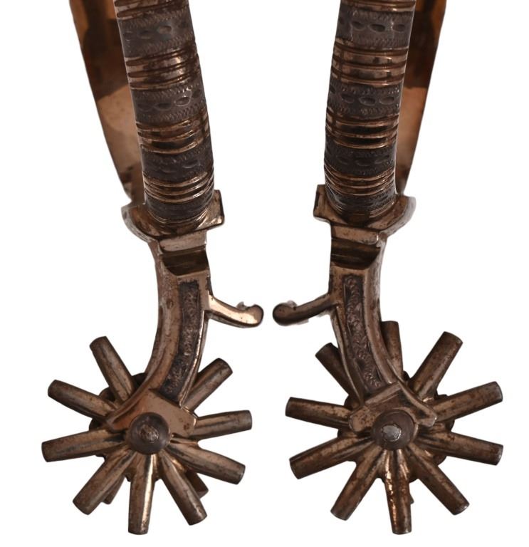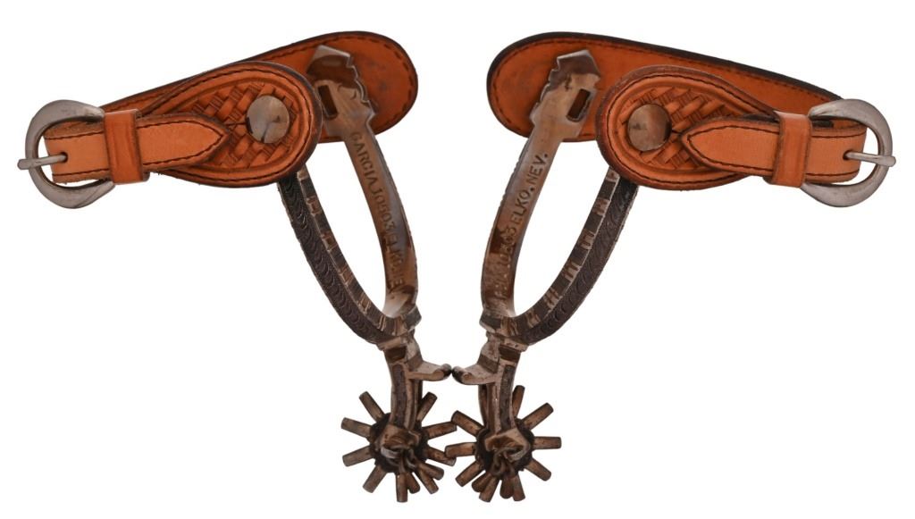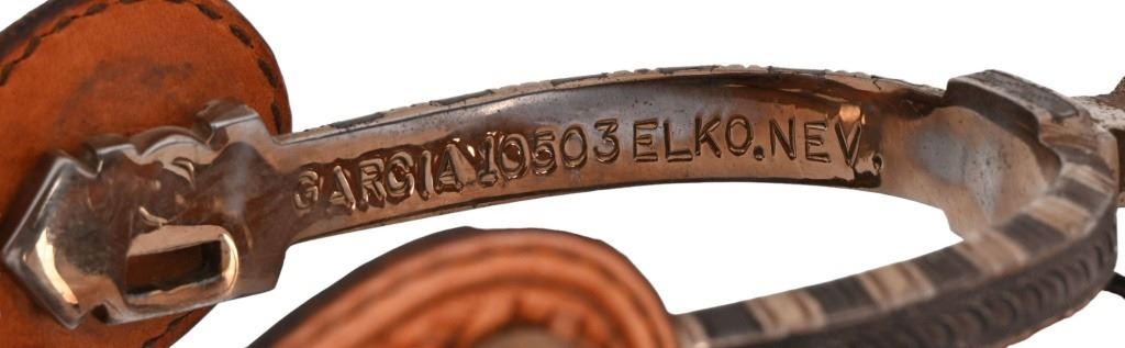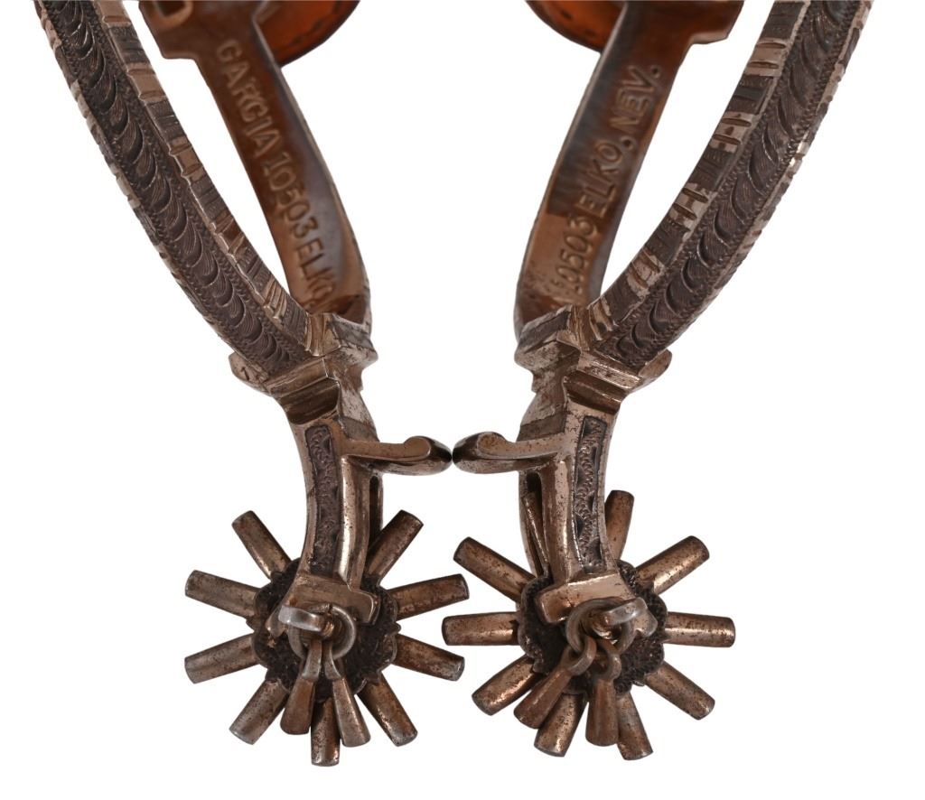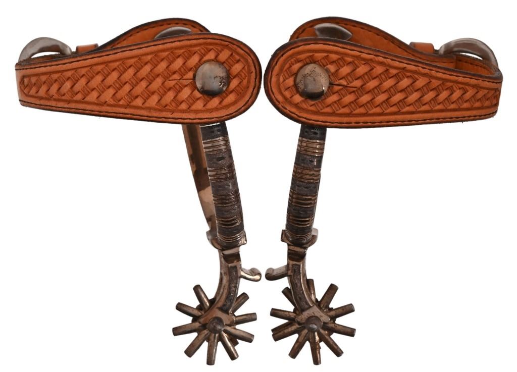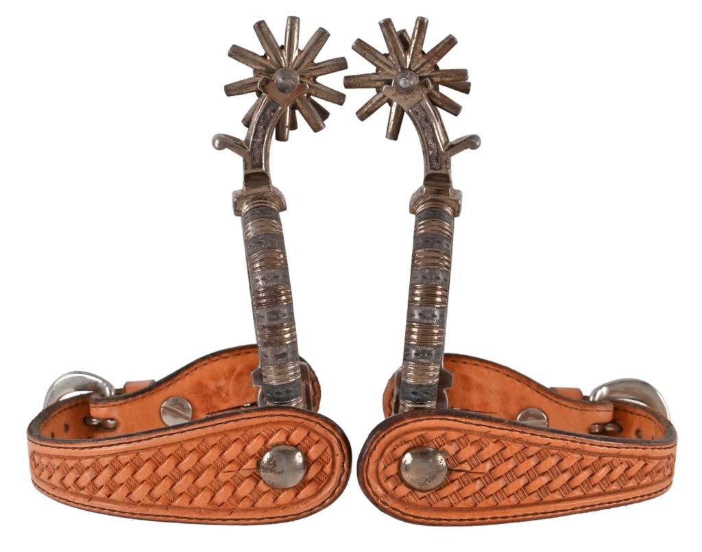Elko Nevada silver inlaid spurs 10503 2" rowels, jingle bobs. Leather tooled straps.