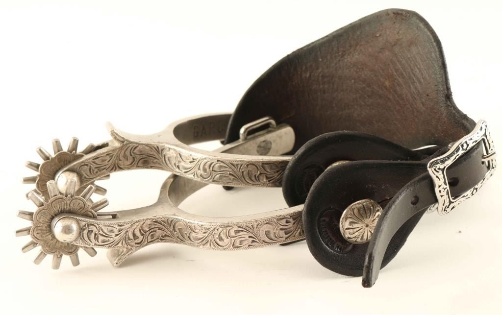 maker marked, with engraved silver overlaid design, tooled wing design leather straps made by John Clark MN.