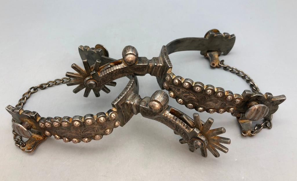 Offered for sale in this lot are a nice pair of Garcia style silver inlay spurs. These Dandy pattern spurs have solid buttons and chap guards with nice silverwork. Maker: Unmarked. Approx. Age: Vintage. Size: Heel opening is 3-1/4 inches. Bands are 1 inch wide. Shanks are 3 inches long with the rowels. Condition: Good for their age, normal wear expected. Please look closely at the pictures - they are an important part of our description. Shipping: There will be a $8 handling / packaging fee for shipping this lot. The actual cost of postage will be added on top of that. BUY IT NOW: If you would like to buy this item now without waiting for the auction to end (this option is only available up to 48 hours before the auction starts to close), the “Buy it Now” price is the high estimate of this lot. If you would like to end the auction early and pay the high estimate (plus applicable fees), please contact us by phone or email and reference this lot number.