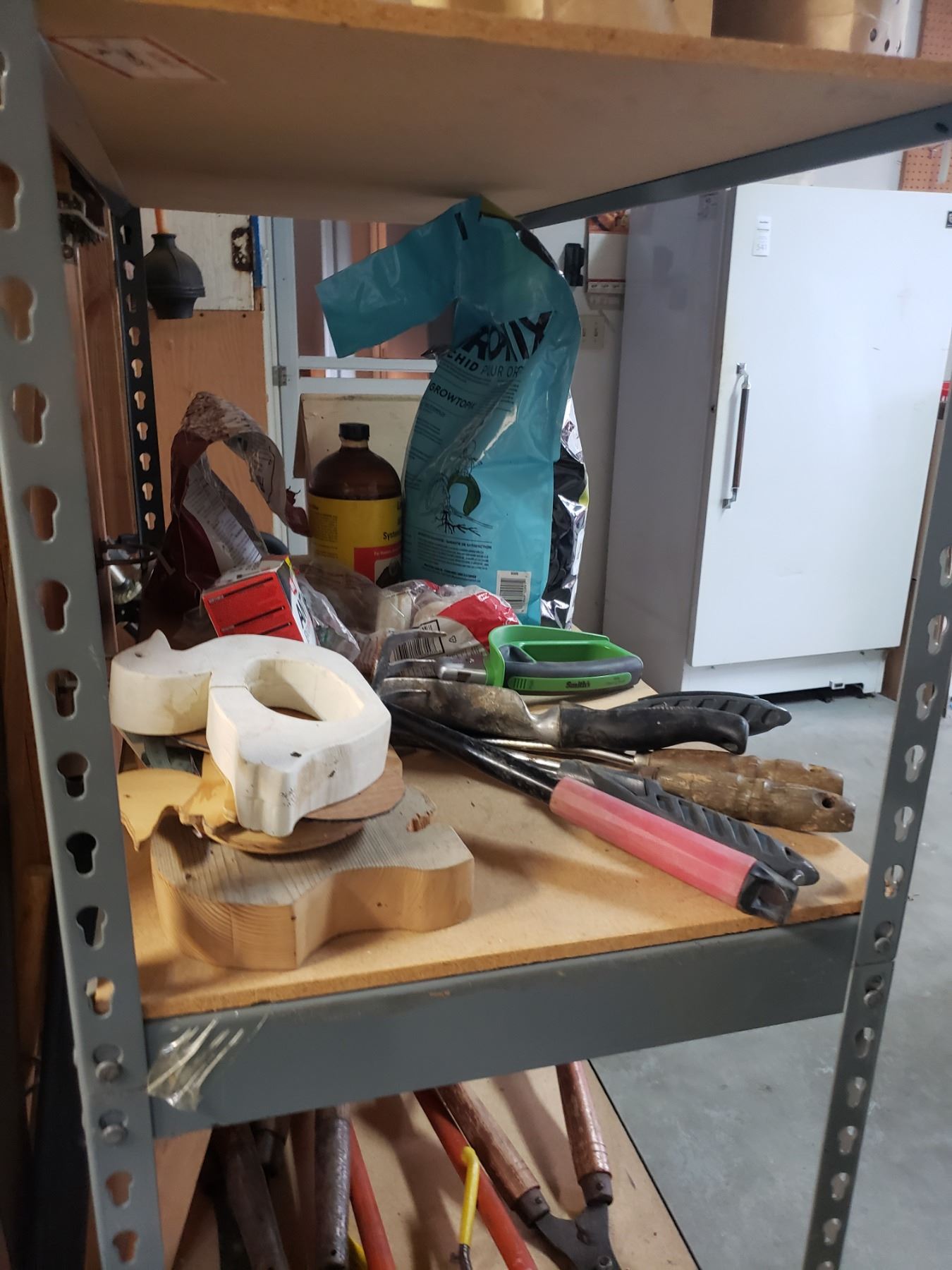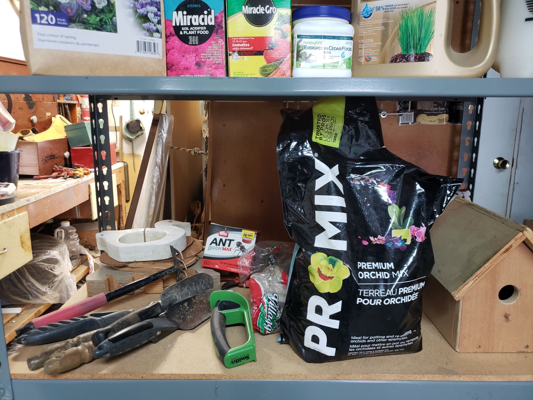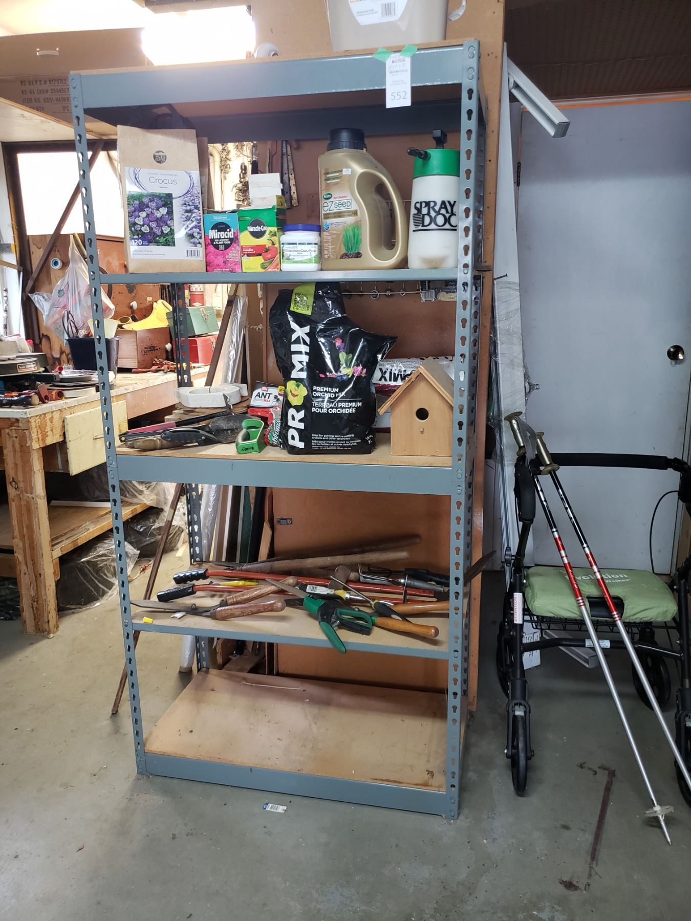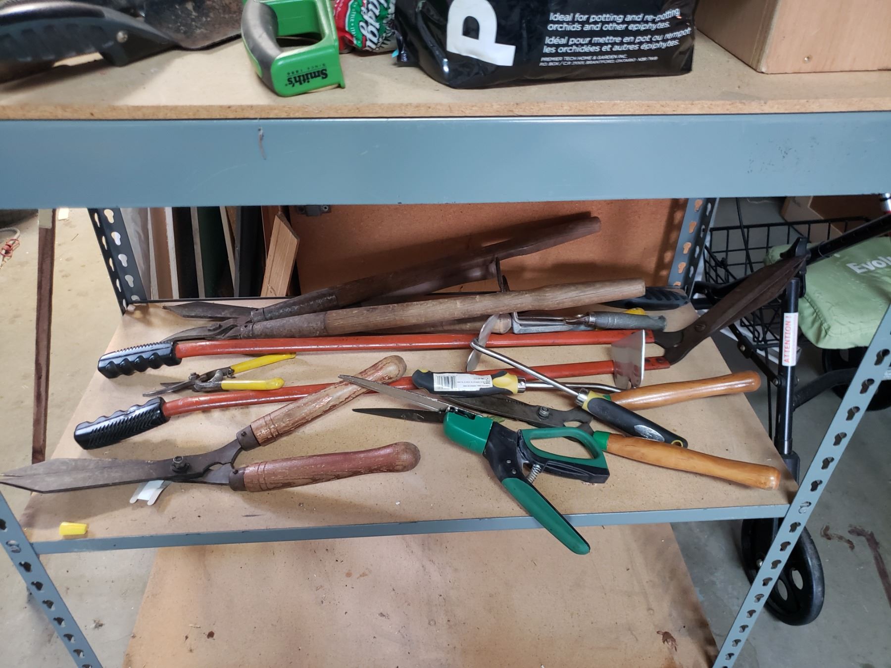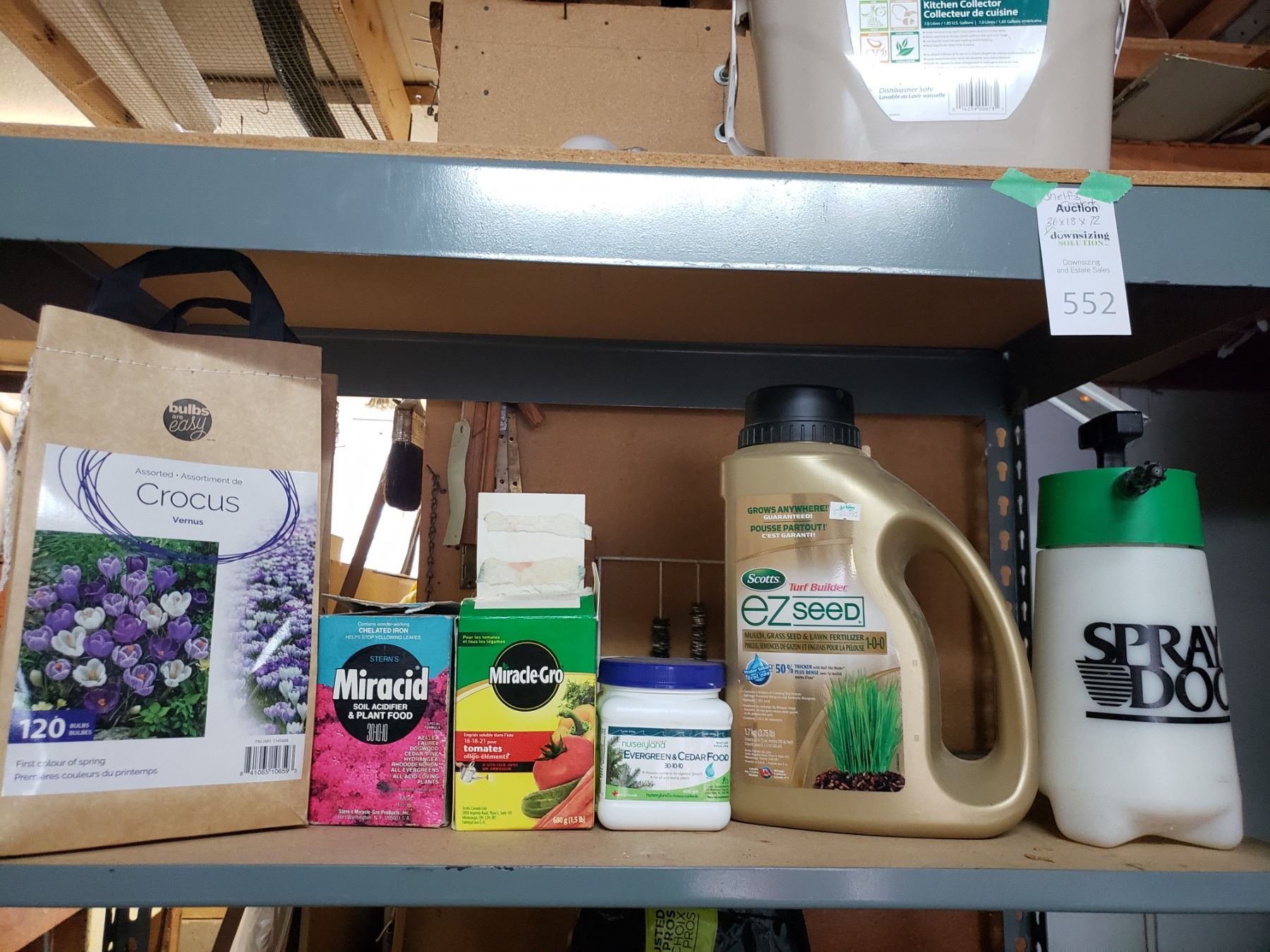 Lot includes shears, clippers, garden nutrients, bird house, hand implements, and bulbs. Bring packing supplies to category C between 11am and 12pm.