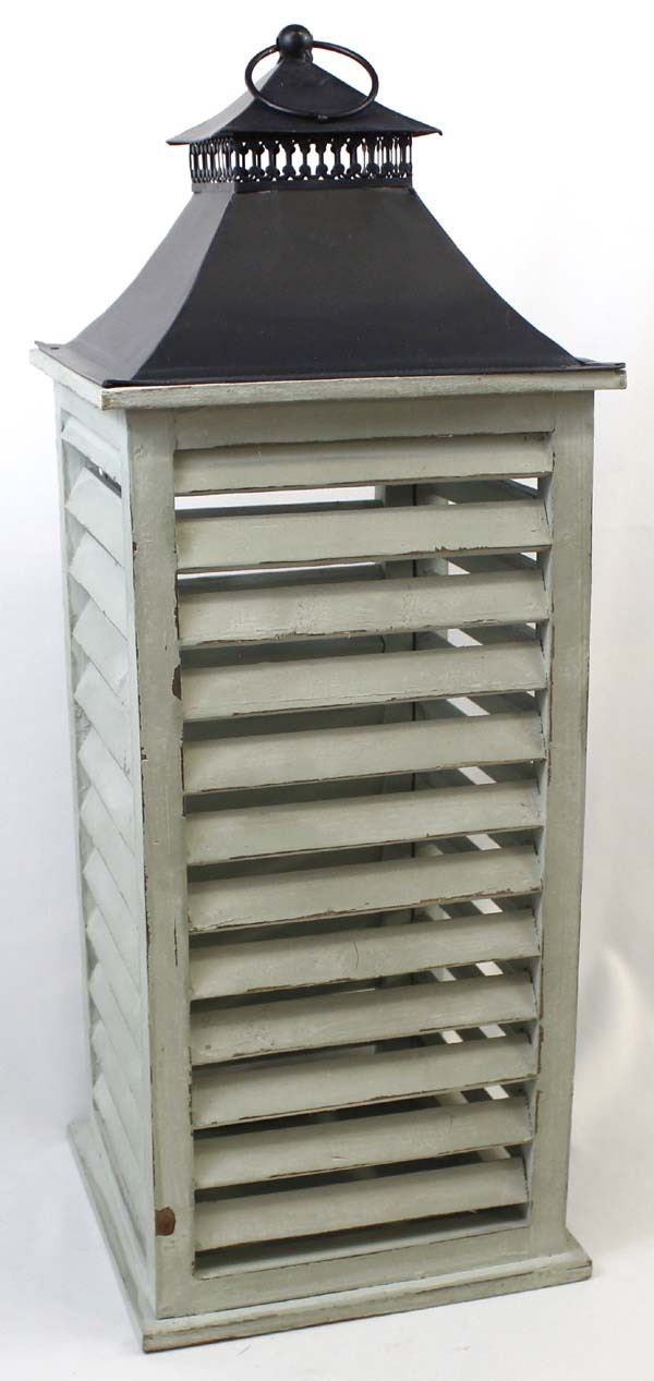 Garden Patio Enclosed Shutter Lamp Decor, has a metal roof, latched door which can house candles, tealights, or battery operated lights, measures 24''H x 9'' x 9''