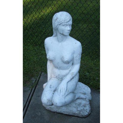 Cast Stone. Statue of young mermaid kneeling on an outcropping of rocks. 35 1/2" high